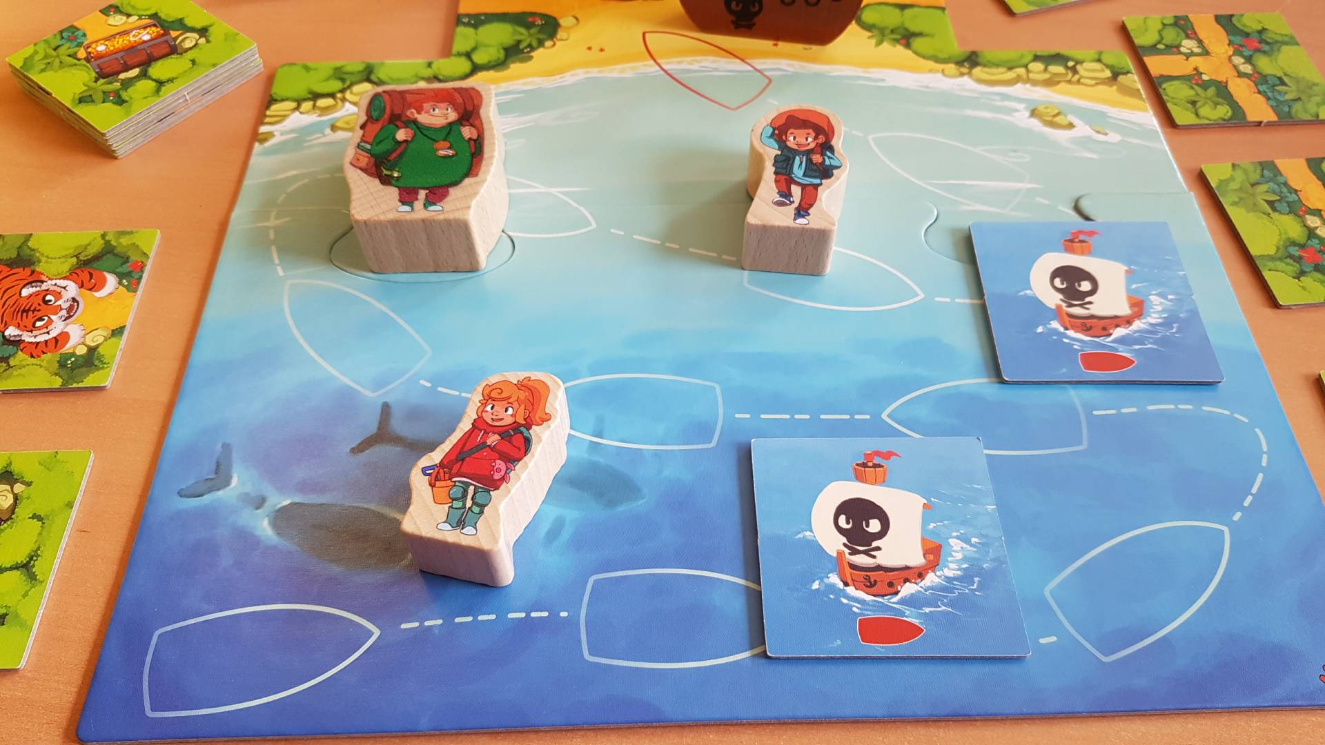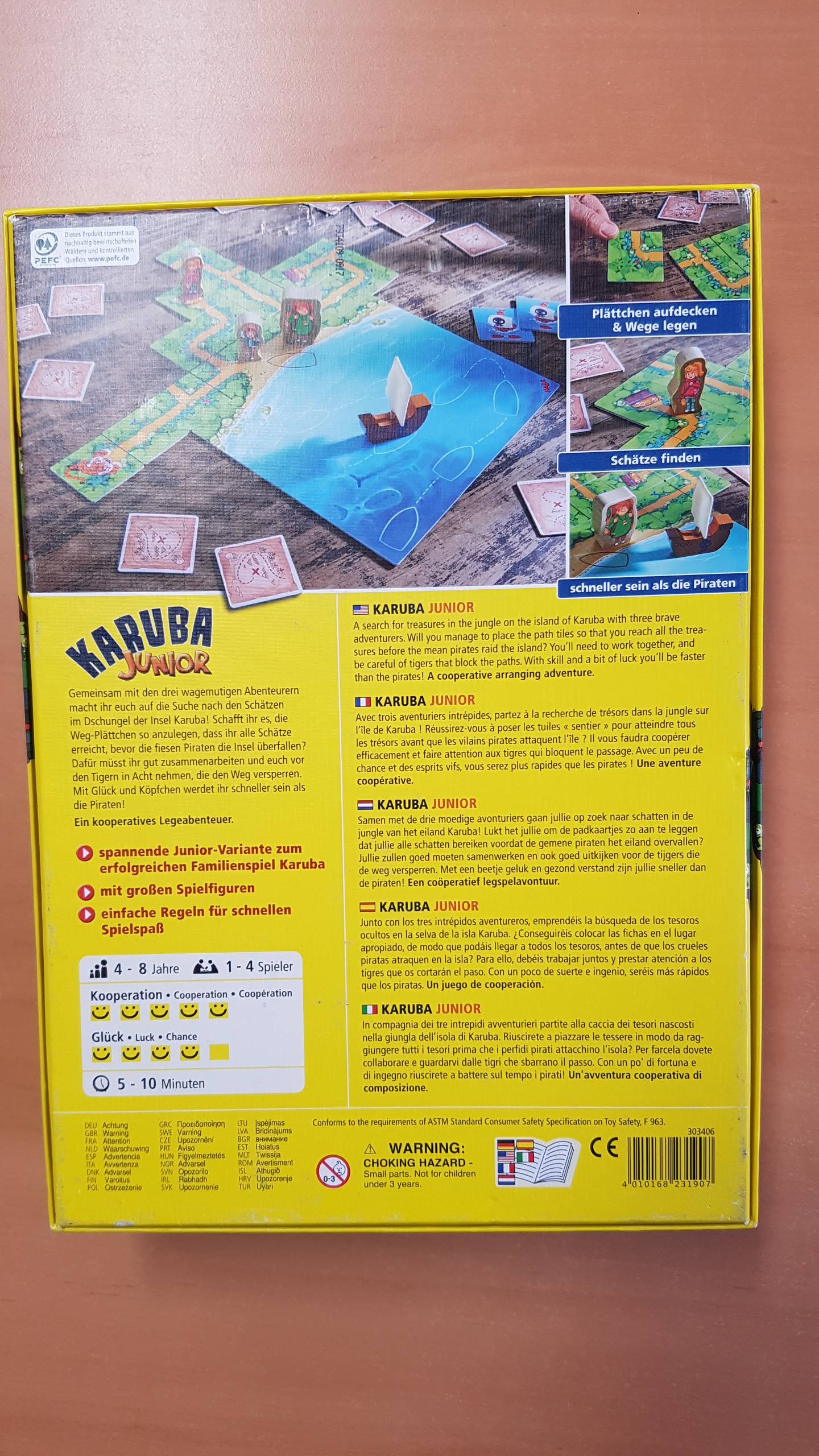 Gemeinsam machen sich die Spieler auf die abenteuerliche Suche nach den Schätzen im Dschungel der Insel Karuba! Schaffen sie es, die Weg-Plättchen so anzulegen, dass sie alle Schätze erreichen, bevor die fiesen Piraten die Insel überfallen? Dafür müssen sie gut zusammenarbeiten und sich vor den Tigern in Acht nehmen, die den Weg versperren. Mit Glück und Köpfchen werden sie schneller sein als die Piraten!