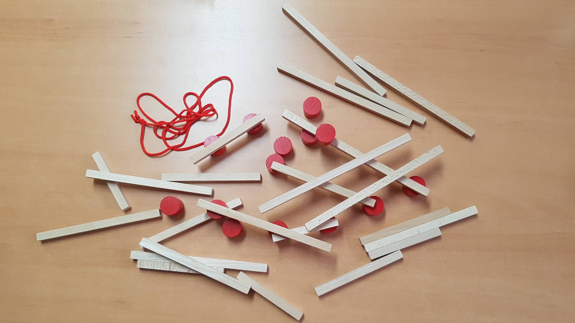 Abschätzen, verbinden, höher bauen! Dem Spieler am Zug wird ein zufälliger Stab zugewiesen. Er bestimmt, welche zwei Säulen er hiermit verbinden möchte. Hat er die Länge des Stabs richtig eingeschätzt, setzt er neue Säulen aus seinem Vorrat auf das Spielfeld. Wer als erster alle eigenen Säulen verbaut hat, gewinnt. Ganz so einfach ist es jedoch nicht! Denn der Spieler am Zug darf seinen Stab erst anfassen, nachdem er sich entschieden hat, welche Lücke er mit diesem überbrücken möchte.