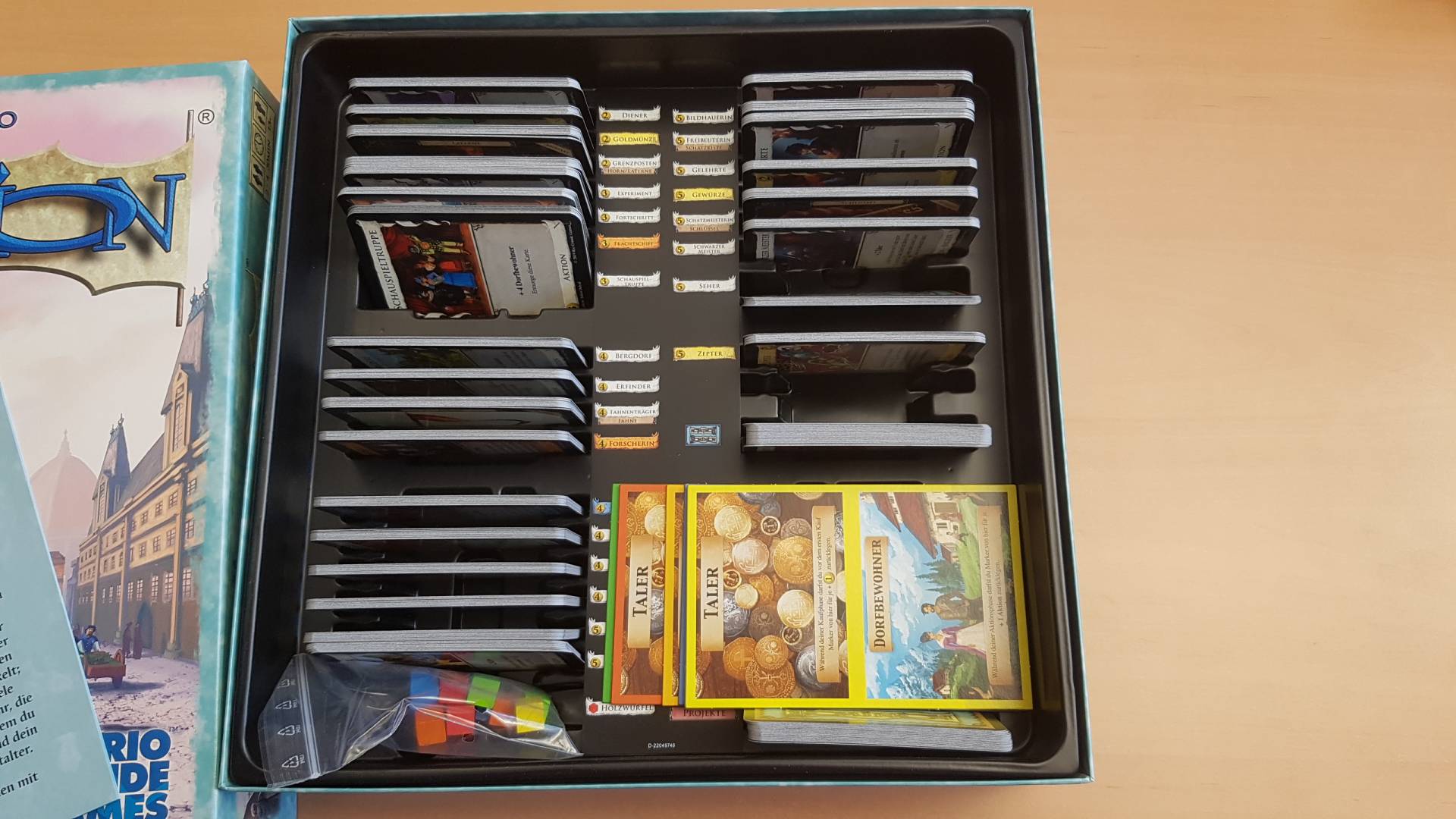 Renaissance ist die 12. Erweiterung von Dominion. Es hat 300 Karten, mit 25 neuen Königreichskarten. Es gibt Token, mit denen Sie Münzen und Aktionen für später speichern können, Projekte, die Fähigkeiten gewähren, und Artefakte, um die Sie kämpfen können.