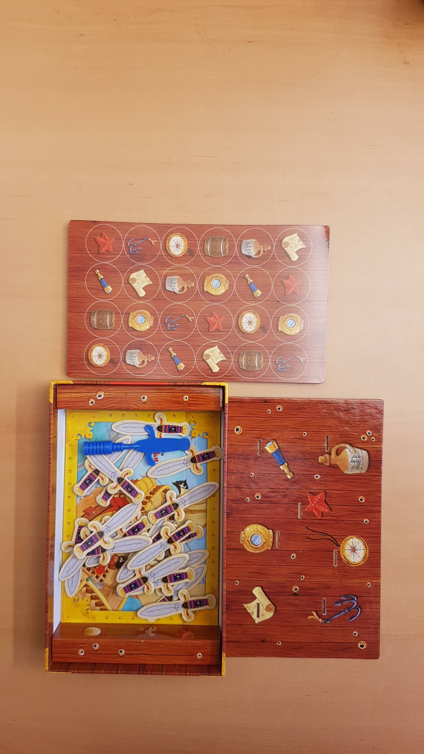 Die Klingen bleiben wackelnd in der Planke des Schiffdecks stecken. Mit viel Geschick versuchen die Piraten, ihr Messer auf einem freien Platz zu werfen. Sobald dort aber schon ein anderes Messer steckt, ist der nächste Spieler dran. Wer hat als Erster alle seine Messer im Holz stecken?