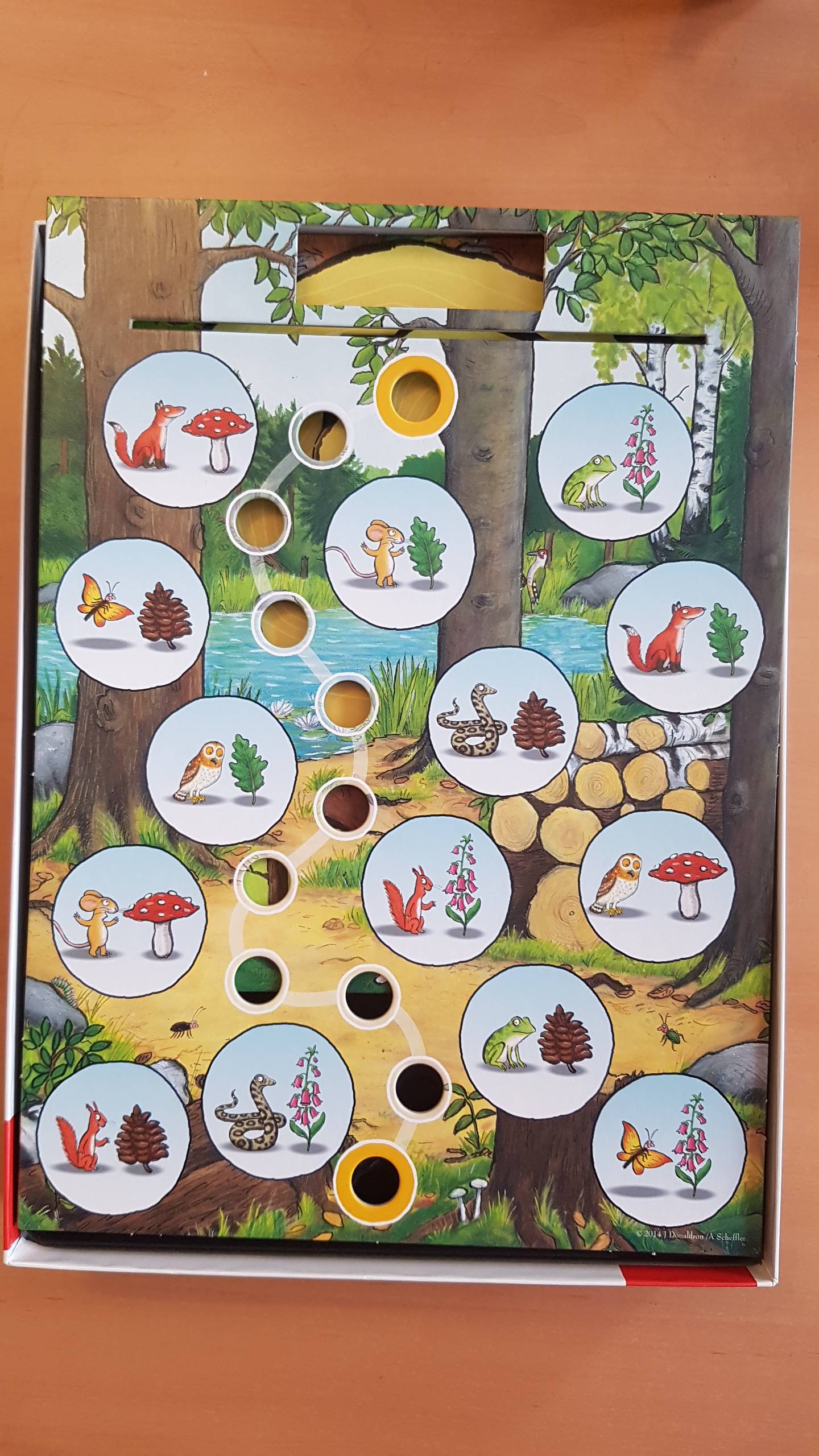 In diesem Würfelspiel versuchen Kinder, ihre Maus-Spielzeugfigur schnell an ihr Ziel zu bringen. Unterwegs lauern hungrige Tiere, denen die Maus nur mit Hilfe des Grüffelos entkommen kann. Aber wo ist der Grüffelo. Unter welchem Baum es sich versteckt hat. Wenn Sie den richtigen Baum gefunden haben, können Sie schnell weitermachen. Würfelglück und ein gutes Gedächtnis helfen Kindern, das spannende Rennen zu gewinnen. Ein tolles Brettspiel für Kinder ab 4 Jahren, basierend auf den bekannten Gruffalo-Büchern.