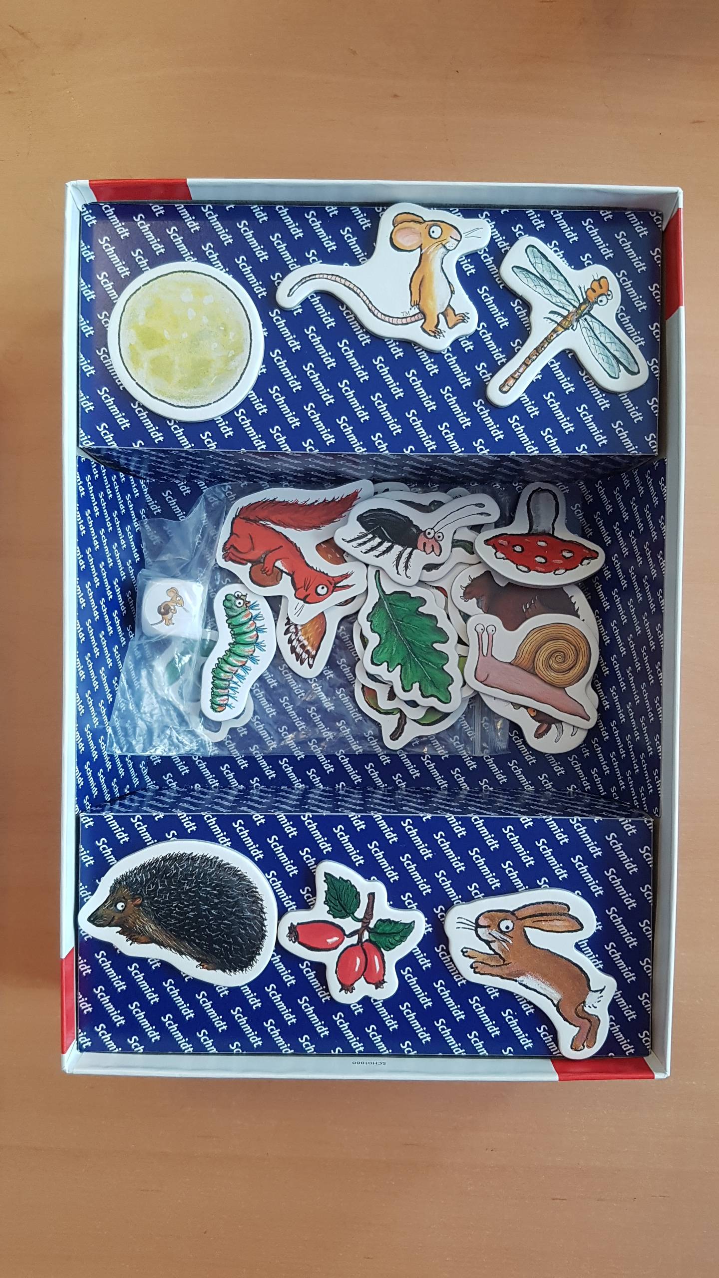 Bei diesem lustigen und kommunikativen Fühlspiel ertasten Kinder auf spielerische Weise unterschiedlichste Formen aus der Welt des Grüffelos. Bis zu drei kleine Entdecker suchen mit ihren Händen im Fühlsack nach den passenden Pappformen zu ihren Bildkarten. Das sollte möglichst schnell gehen! Denn ein Spieler, versucht gleichzeitig die clevere Maus zu würfeln, um die anderen abzulösen. Wer als erster alle Formen zu seinen Karten gefunden hat, gewinnt das Spiel! Aber Achtung, im Fühlsack versteckt sich auch der Grüffelo …