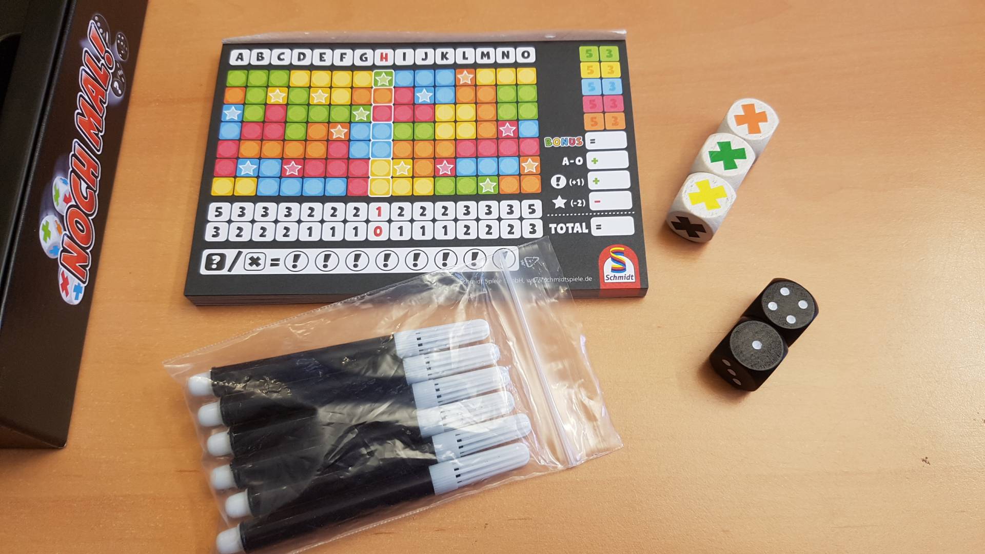 Alle spielen gleichzeitig, keiner muss lange warten, und wenn’s vorbei ist, dann heißt es sofort: "NOCH MAL!" Ein Spieler wirft alle 6 Würfel, sucht sich 2 davon aus und kreuzt das Ergebnis an. Die anderen Spieler wählen aus dem gleichen Wurf 2 der verbliebenen 4 Würfel und kreuzen das Ergebnis bei sich an. Die Auswahlmöglichkeiten wachsen, je schneller sich die Spieler mit ihren Kreuzen ausbreiten, aber Punkte gibt es nur für komplette Spalten! Da gilt es abzuwägen und im richtigen Moment zuzuschlagen. NOCH MAL!, das geniale Spiel mit Suchtfaktor! Bei einer Partie bleibt’s nie! Besonders gut geeignet für 2 Spieler! Mit einer Variante für 1 Spieler.