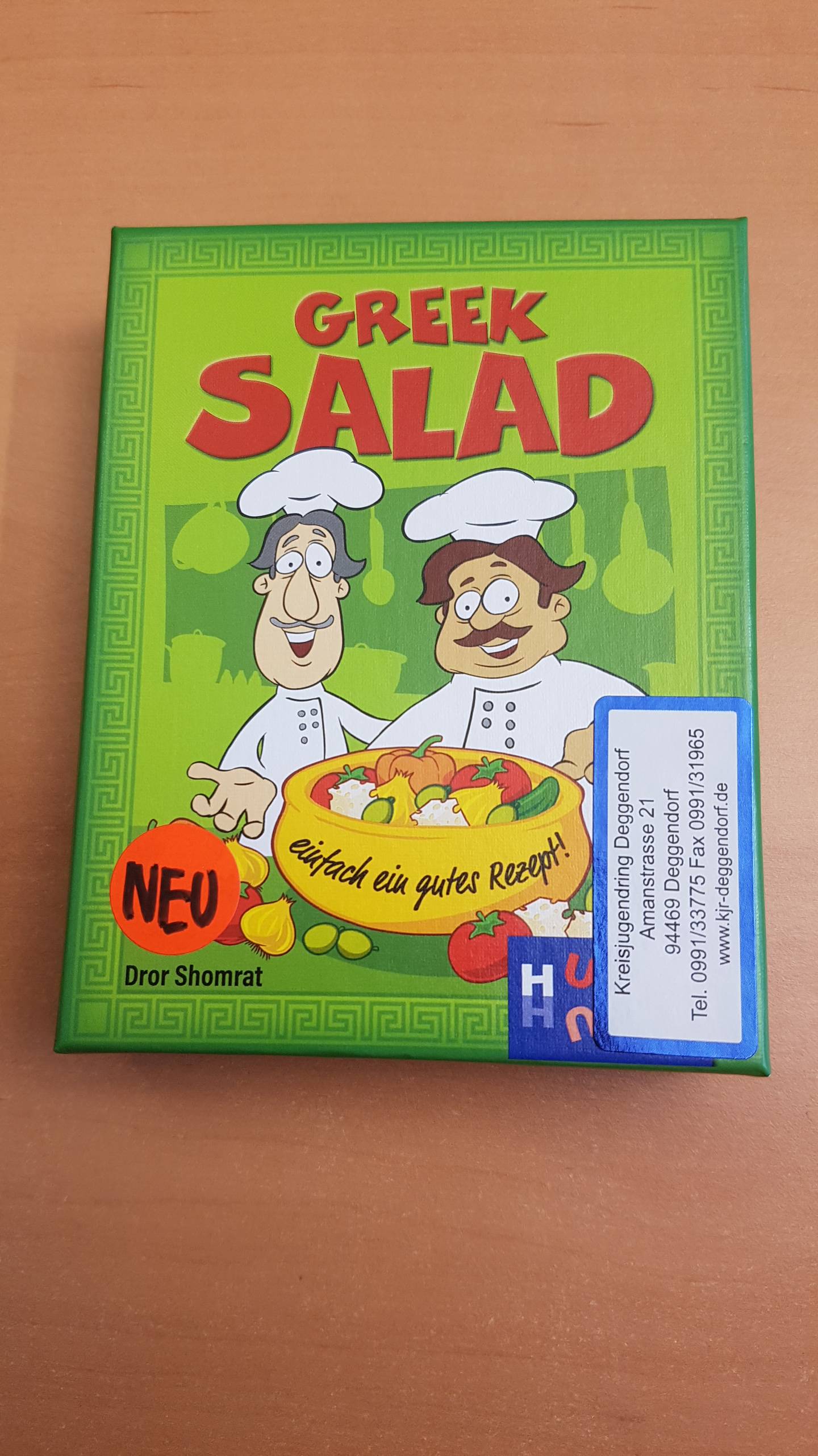 In der Küche geht es hoch her. Bestellungen werden aufgegeben und die Köche müssen liefern. Die leckere Spezialität des Hauses: Griechischer Salat. Hilf den Köchen beim Zubereiten, kümmere dich um die richtigen Zutaten und befolge die Anweisungen der Chefköche! In Greek Salad versuchen die Spieler als erste ihre Handkarten abzuspielen. Tomaten, Paprika oder Oliven müssen in die Schüssel. Doch Vorsicht! Die Menge ist entscheidend und die Chefköche haben das letzte Wort! Wer schnell ist, clever spielt und als Erster alle Karten abgespielt hat, gewinnt … und darf sich im Anschluss einen leckeren Salat gönnen.