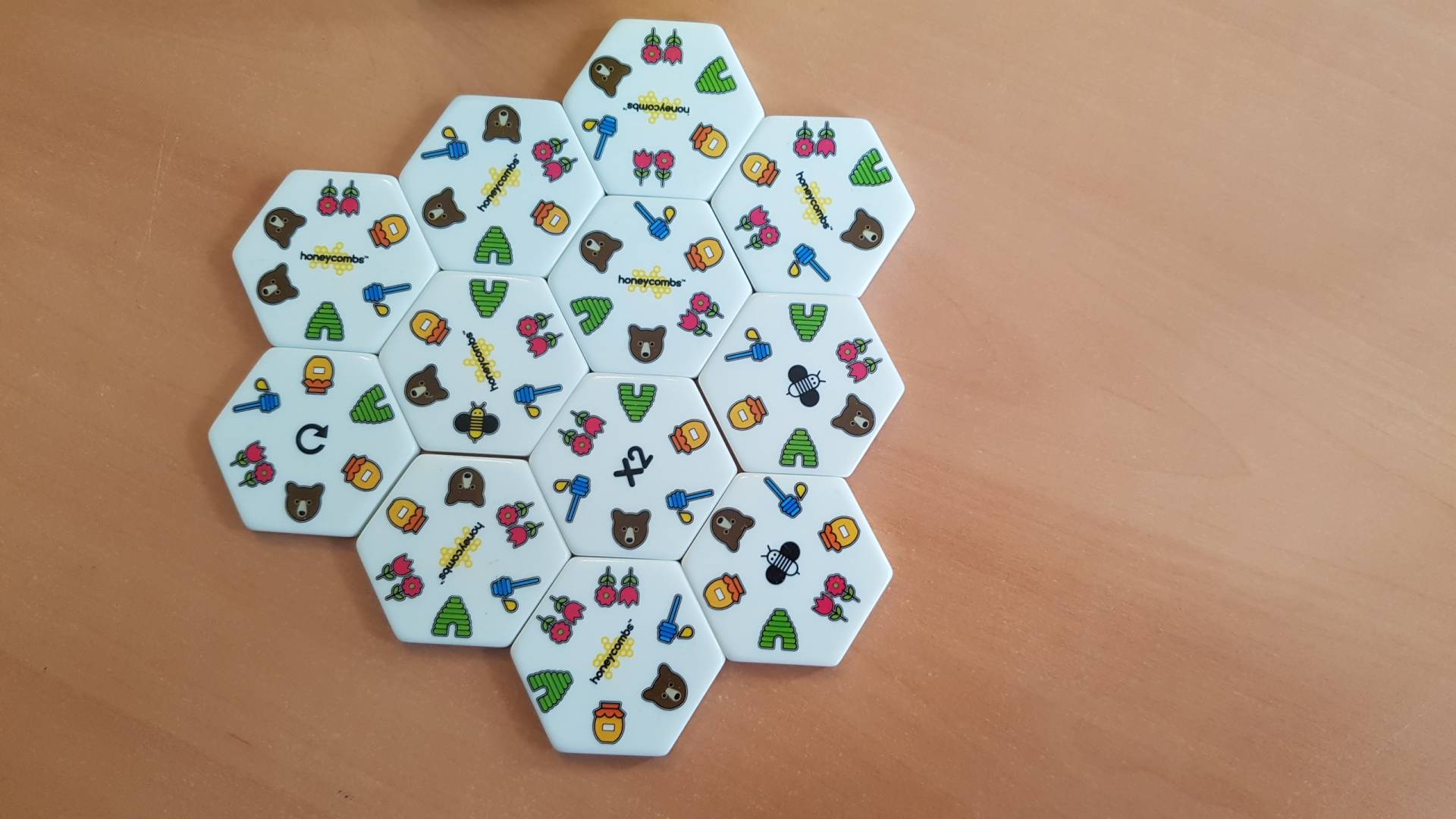 »Ziel ist, die sechseckigen Spielstei-ne so aneinander zu legen, dass alle Seiten, die sich berühren, das gleiche Symbol zeigen. Mit 3 Spielvarianten!« (Piatnik)