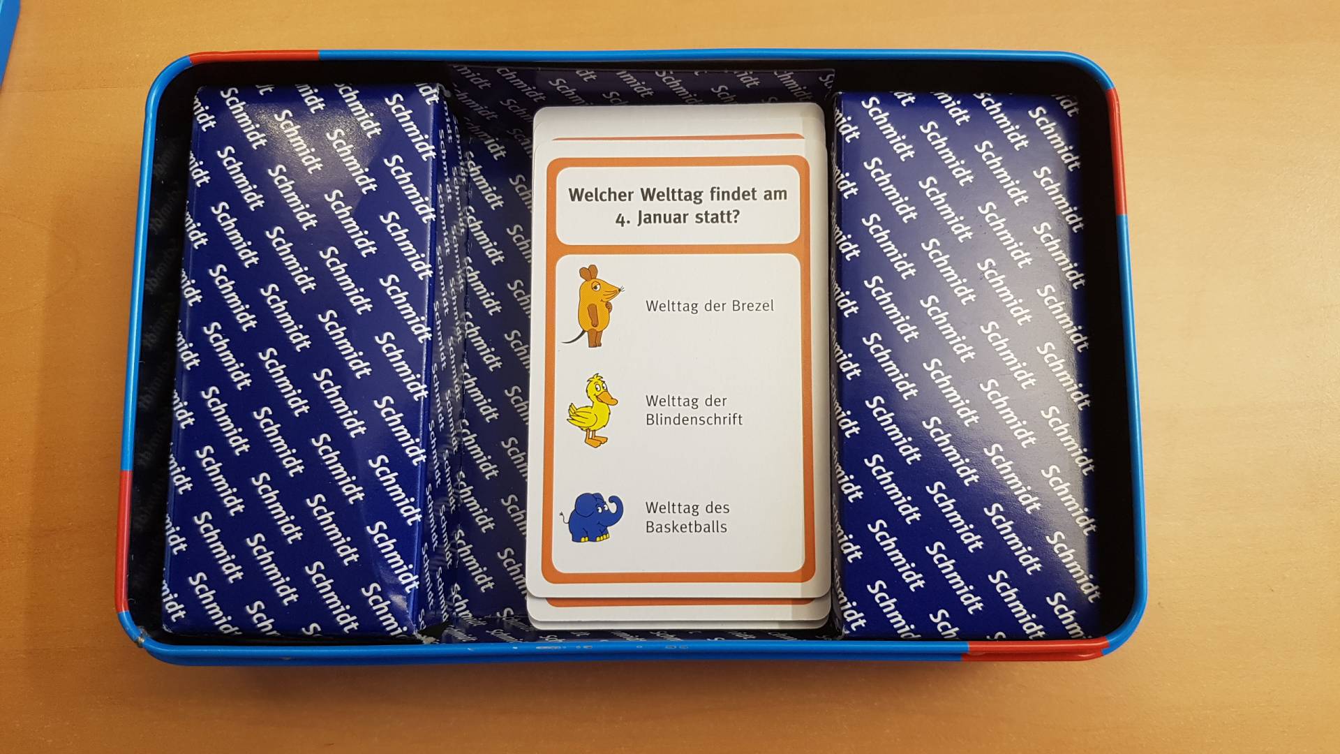 Der älteste Spieler beginnt damit, die oberste Karte vom Stapel zu nehmen und dem Spieler zu seiner Linken die Frage vorzulesen.