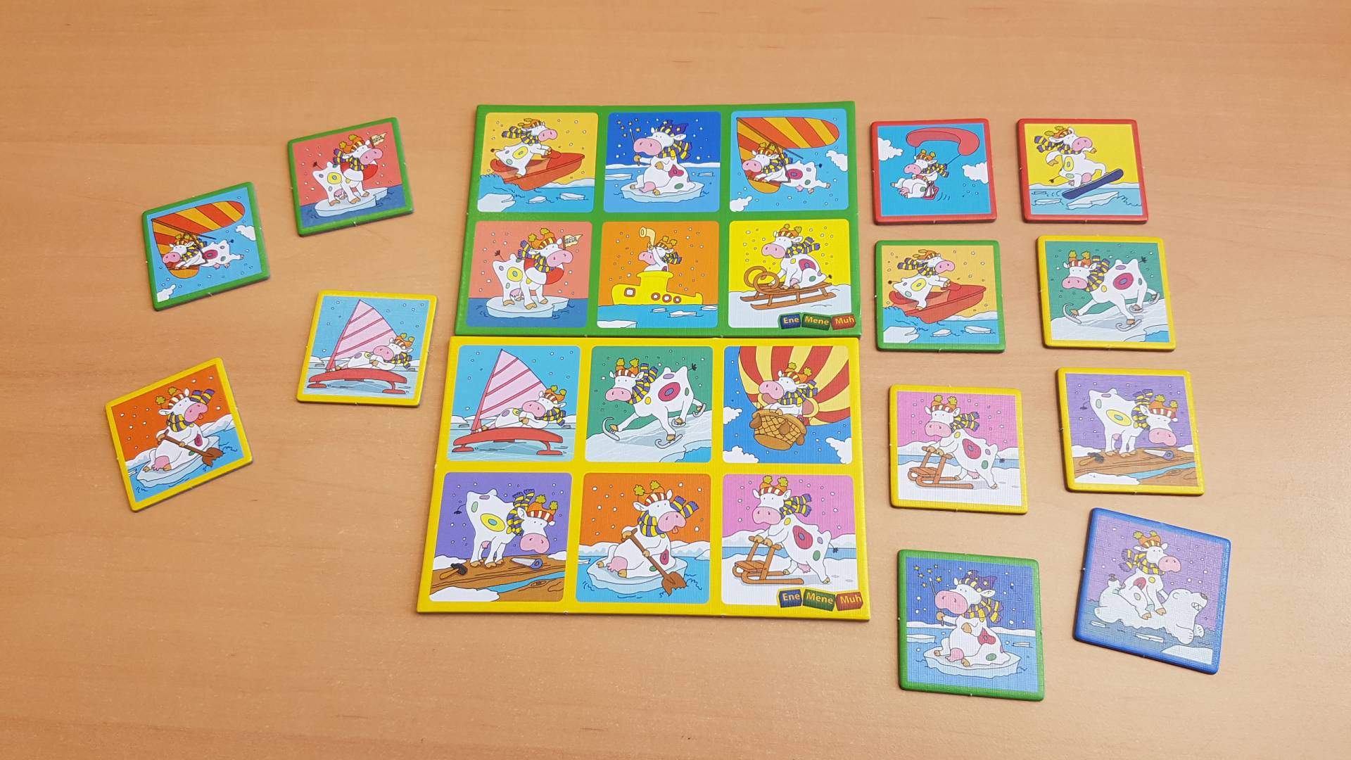 Wer holt die Kuh vom Eis ist eine Variation von Memory. Auf den Tafeln sind jeweils 6 Abbildungen der Kuh in verschiedenen Situationen auf, über oder auch im Eiswasser abgebildet, darunter der Ritt auf einer Rakete oder auf einem Floß dahintreibend. Jede der Abbildungen hat ein entsprechendes Gegenstück auf den Plättchen. 4 Dieser Plättchen zeigen 2x einen Wirbelsturm, und 2x ein Thermometer. Ziel des Spiel ist, als erster die zur eigenen Tafel passenden Plättchen zu finden.