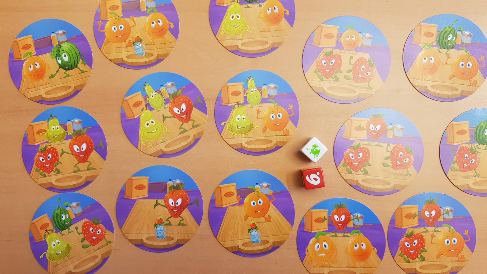 Wie viele Pfirsiche sind in der Schüssel? Gar nicht so einfach zu beantworten, wenn alle Kinder wie wild ihr Obst hinein werfen. Jeder Spieler hat seinen eigenen Stapel Fruchtkarten und versucht, ihn als Erster loszuwerden. Dazu legen sie die Karten in die Mitte und versuchen sich dabei zu merken, was die anderen legen. Denn wenn die von den Würfeln angezeigte Menge erreicht ist, heißt es schnell sein. Wer sich zuerst den Stapel schnappt und richtig liegt, darf den anderen Spielern richtig viele Karten geben. Fruit Salad ist ein rasantes und raffiniertes Spiel für schnelle Merker.