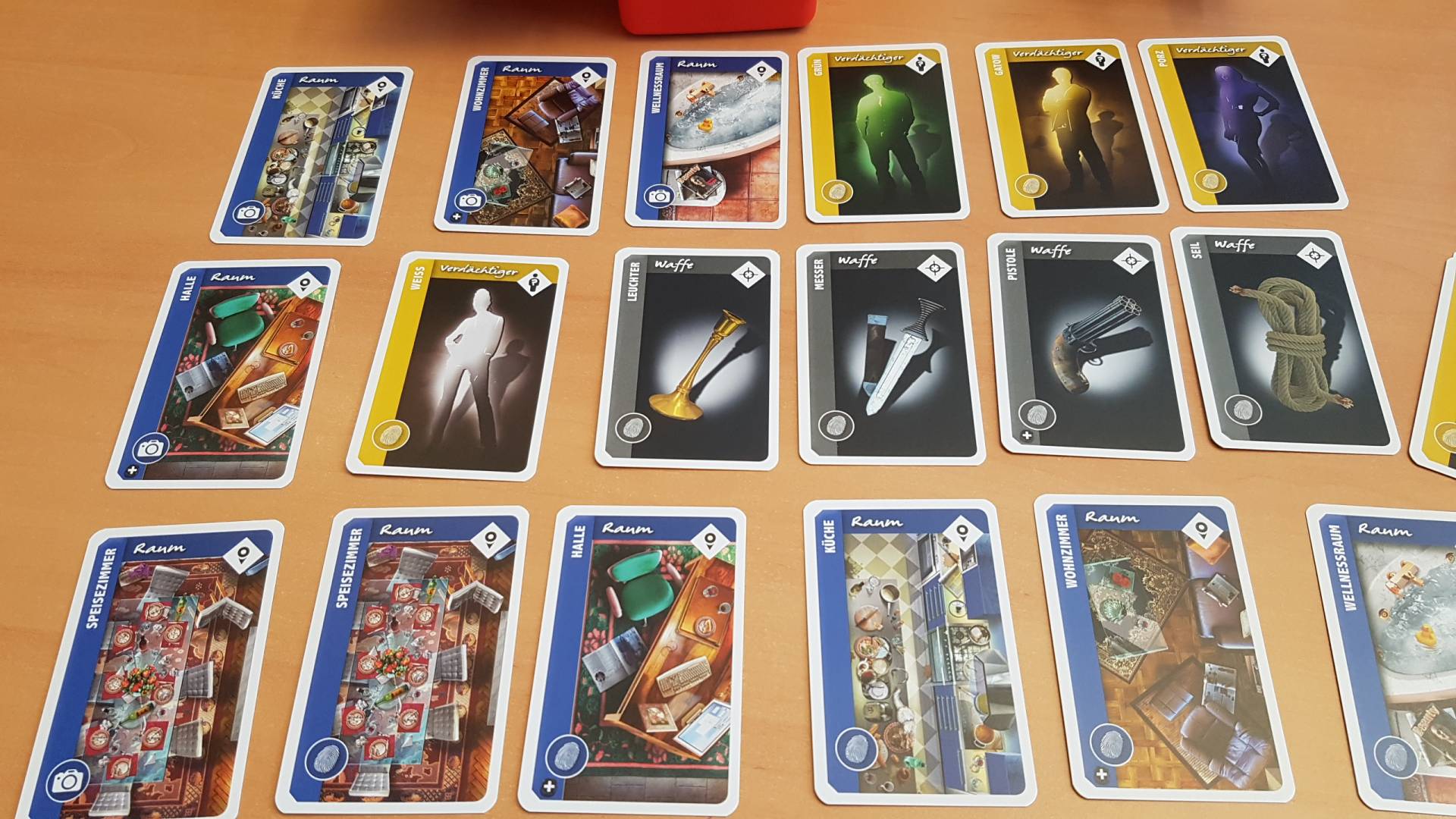 Stellen Sie Fragen zu den Waffen und Orten der Cluedo-Charaktere auf Ihren Karten, um herauszufinden, wer es mit was und wo getan hat.