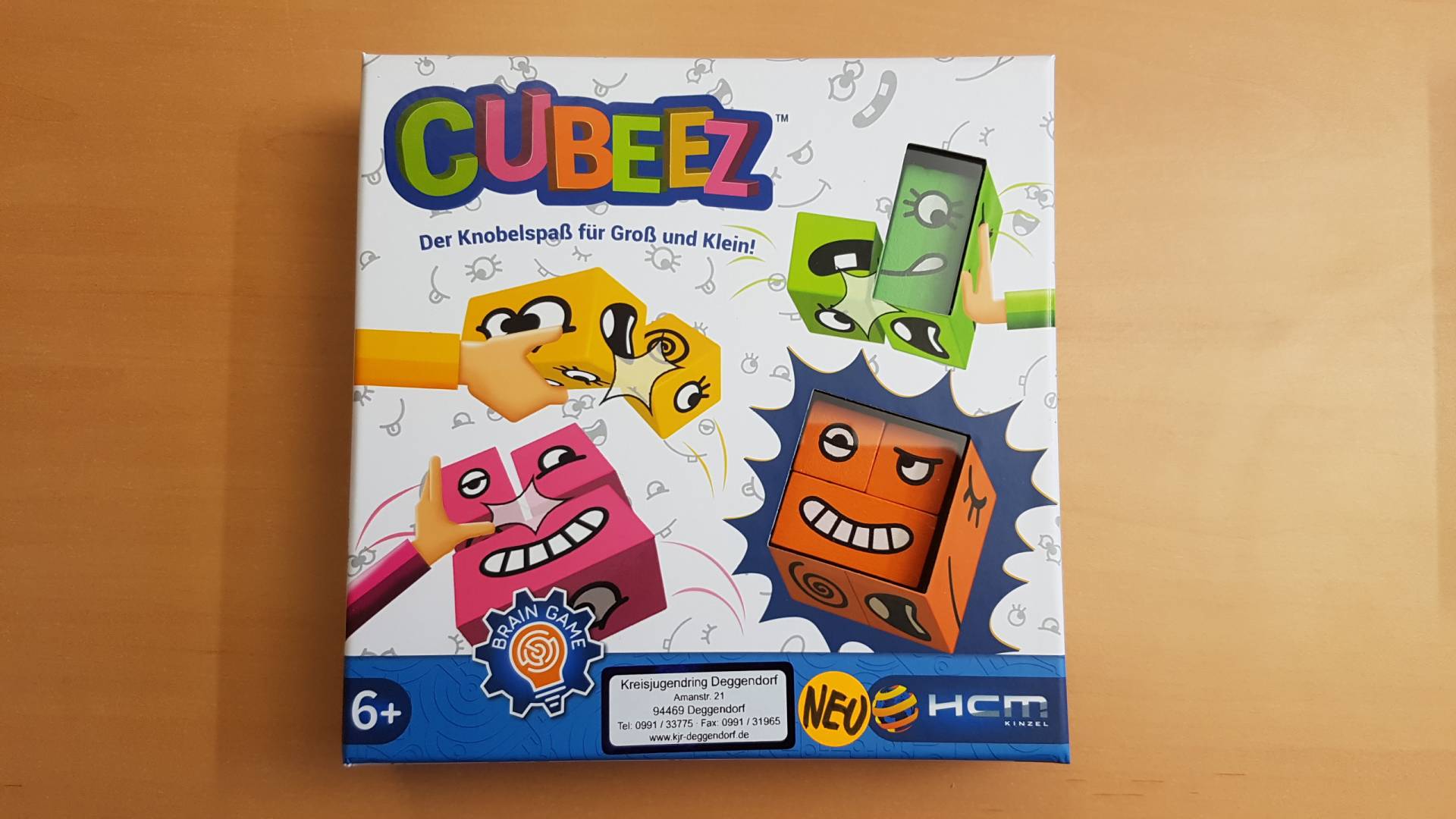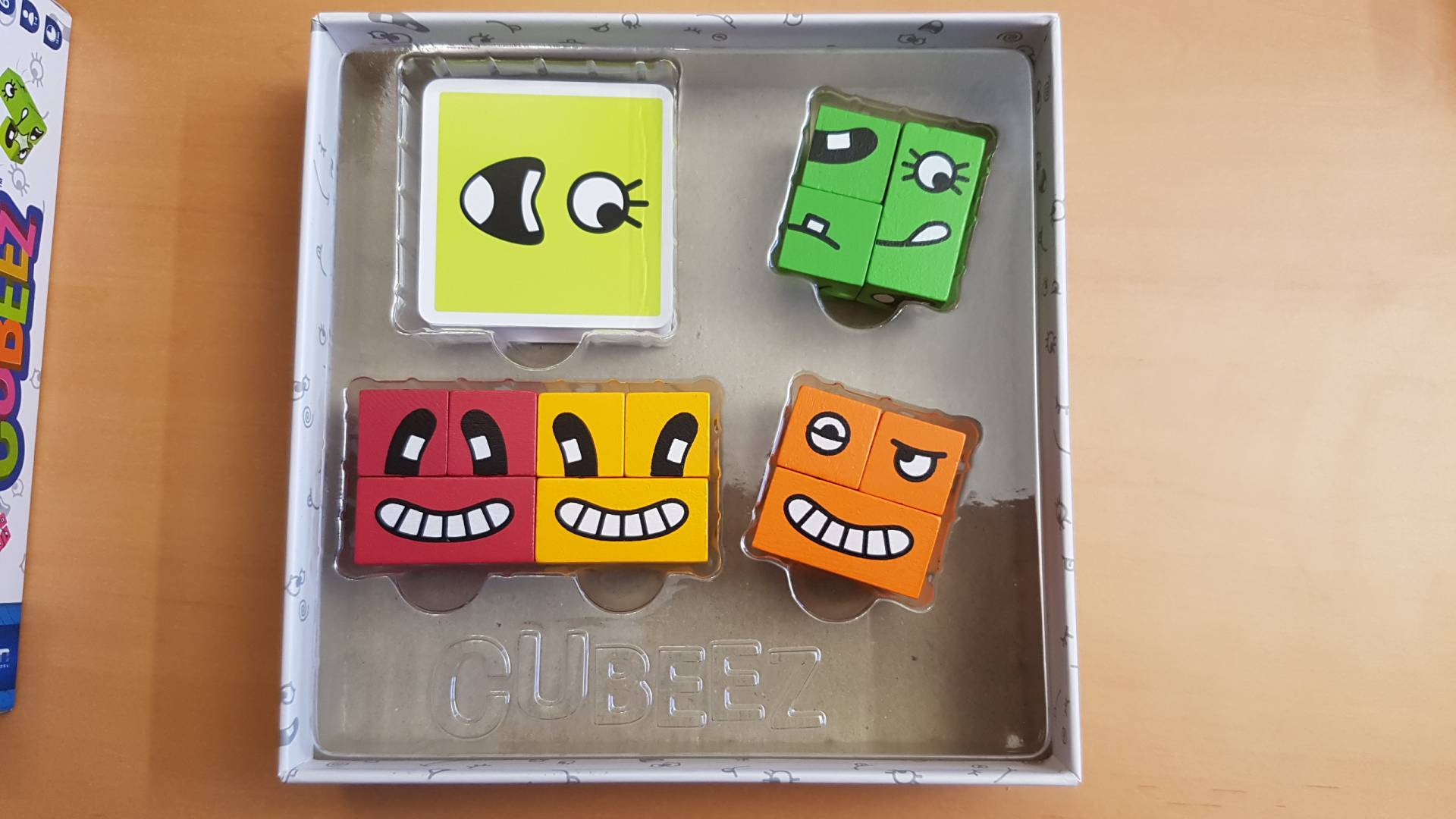 Cubeez Ein Auge hier, ein Lächeln dort. Schnell! Dreht eure bunten Cubeez-Würfel und findet die richtigen Seiten um das Gesicht der Aufgabenkarten nachzubilden. Ihr müsst ein kühles Köpfchen bewahren um mit den Würfeln die richtige Grimasse zu legen. Alle Spieler treten gleichzeitig gegeneinander an. Wer legt das Gesicht mit seinen 3 Holz-Spielsteinen am schnellsten nach? Jeder Spieler nimmt sich einen Satz Cubeez in einer Farbe. Danach wird eine der Aufgabenkarten umgedreht. Der erste Spieler, der die Aufgabe mit seinen Blöcken nachbilden konnte, gewinnt die Karte! Die nächste Aufgabenkarte wird aufgedeckt und das Spiel läuft weiter.