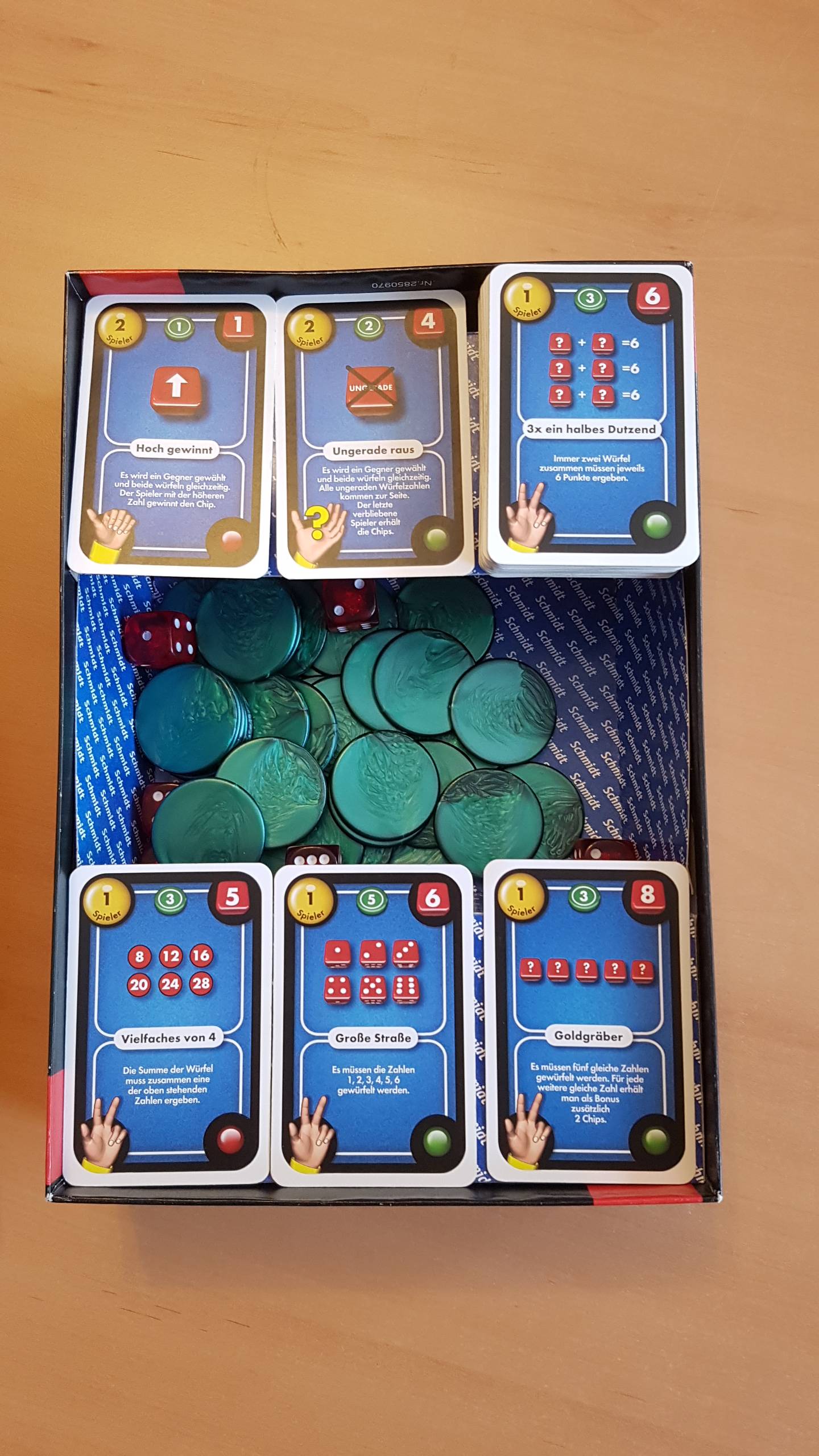 Versuche dein Glück bei einer von 54 kniffligen Aufgaben! Je größer die Herausfoderung, desto größer der Lohn. Und wenn die Würfel mal nicht so wollen, kann man sie vielleicht später mit Chips überzeugen.