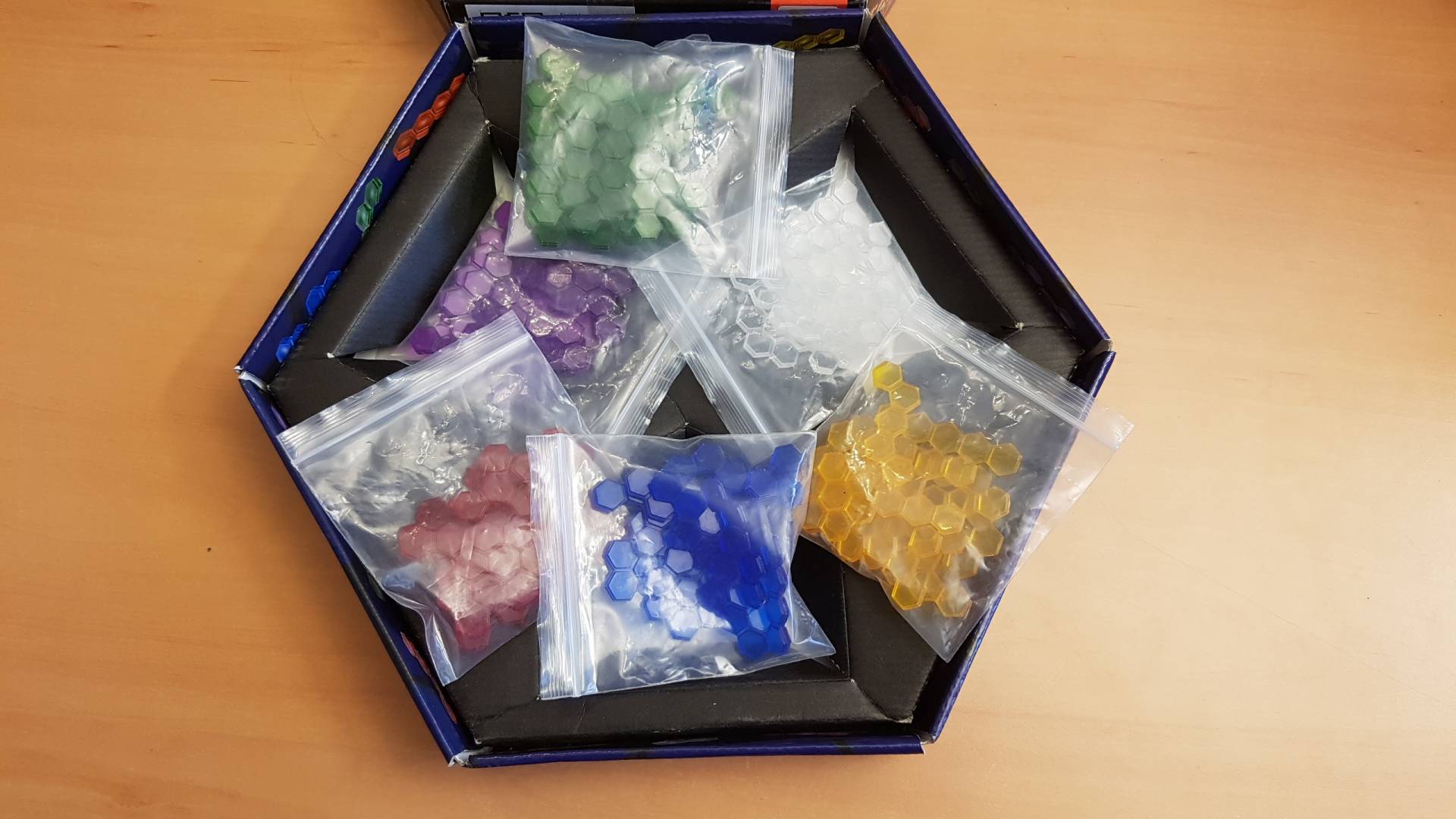 Gemblo ist ein abstraktes Strategiespiel mit durchscheinenden, farbigen Figuren, die jeweils aus einem bis fünf Sechsecken bestehen. Jeder Spieler hat ein identisches Set von Figuren in einer einzigartigen Farbe. Das Ziel ist es, alle Ihre Figuren loszuwerden, indem Sie sie auf das sechseckige Spielbrett legen. Jedes Stück, das Sie nach dem ersten platzieren, kann zuvor platzierte Stücke der gleichen Farbe nicht berühren. Stattdessen muss jedes Stück einen Abstand von "1" von einem anderen Stück der gleichen Farbe haben, wobei 1 die Länge einer Seite eines der kleinen Sechsecke ist. Eine weitere Einschränkung besteht darin, dass die gemessene Entfernung die Figur eines anderen Spielers nicht direkt überqueren kann, sondern an der Kreuzung zweier Figuren liegen kann. Sobald alle Spieler so viele Figuren wie möglich platziert haben, zählen sie die Anzahl der sechseckigen Einheiten in den Figuren, die sie nicht platzieren konnten, und der Spieler mit der niedrigsten Punktzahl gewinnt.