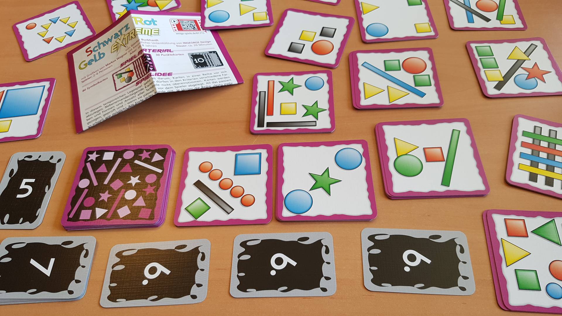 Zugreifen – erkennen – einreihen! In diesem extrem spaßigen und temporeichen Legespiel geht es darum, Karten in einer Reihe vor sich abzulegen – und das so schnell wie möglich. Denn alle Spieler sind gleichzeitig am Zug. Nebeneinanderliegende Karten müssen sich in den Eigenschaften Farbe, Form und Menge unterscheiden. Klingt einfach! Aber nicht immer ist der Schnellste auch der Beste. Am Ende jeder Runde gilt: Je länger die Reihe, desto mehr Punkte. Nach fünf Runden gewinnt der Spieler mit den meisten Punkten.
