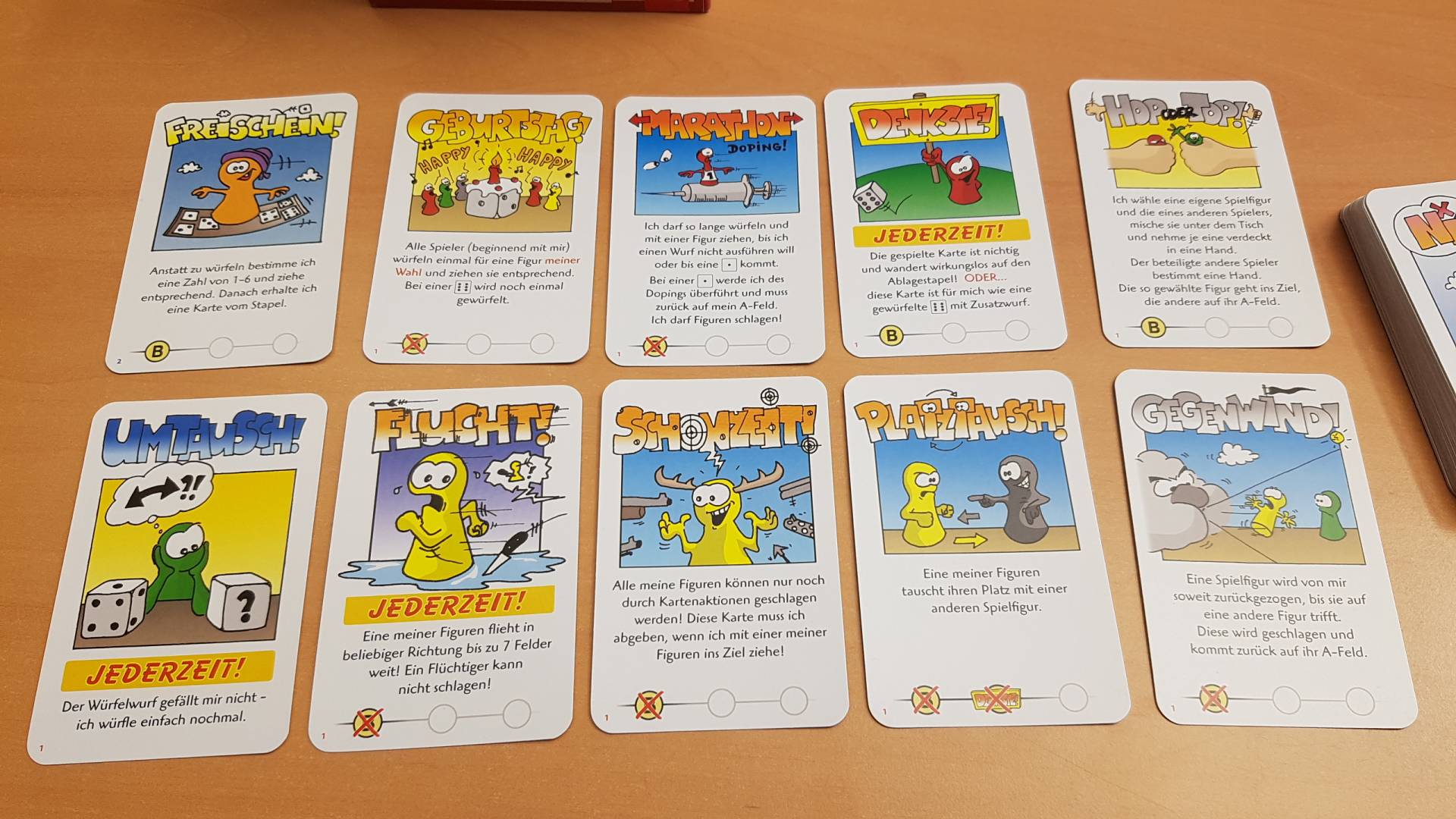 Mit diesen Karten ist noch mehr Ärger garantiert! Wer an der Reihe ist und würfelt, zieht eine Karte. In der nächsten Runde kann, statt einen Würfel zu werfen, eine Karte gespielt werden. Zwölf Felder weit laufen, den Schutzengel zu Hilfe rufen, zwei Figuren tauschen den Platz und vieles mehr... Da kommt Schwung in den beliebten Klassiker!