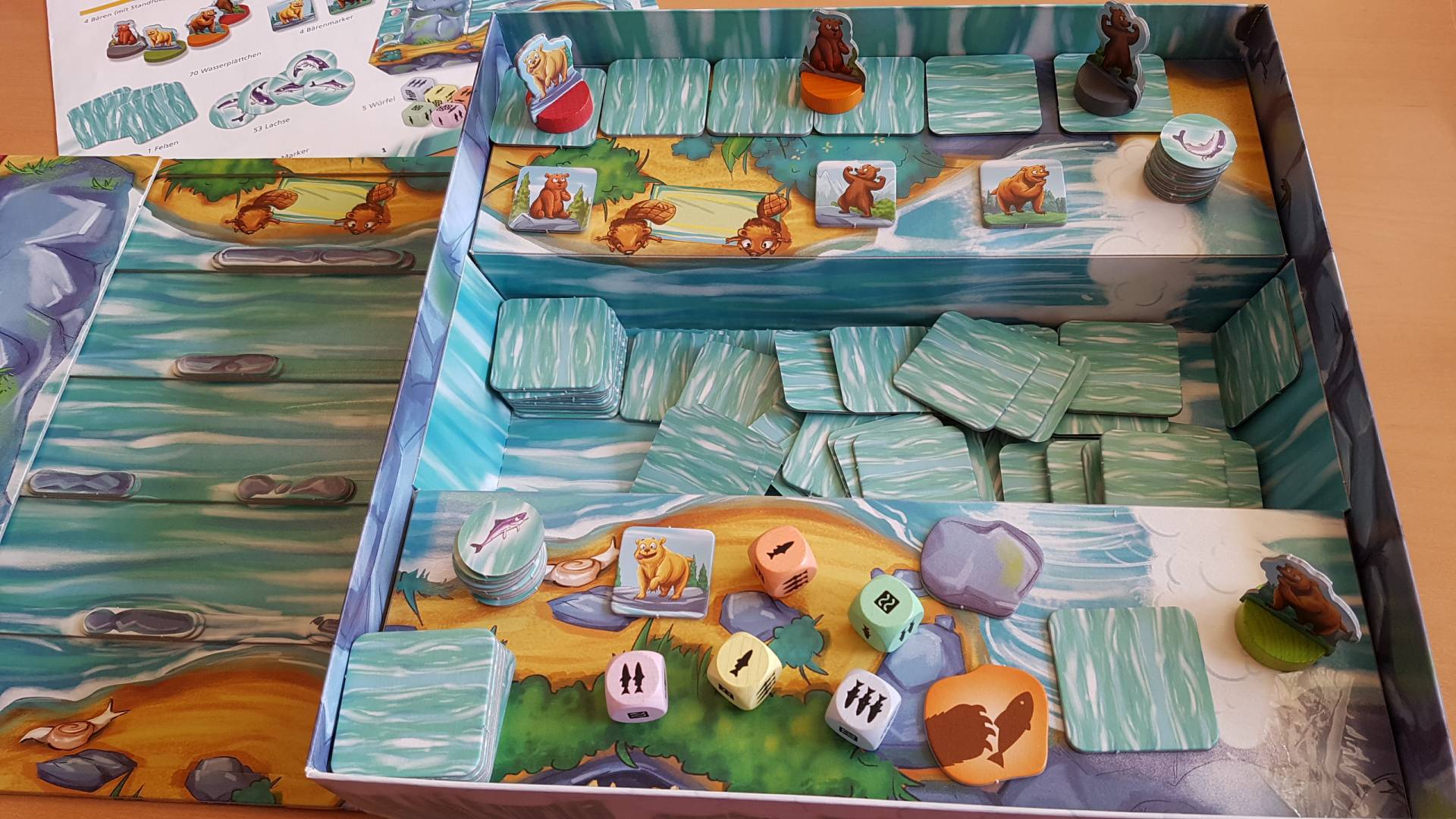 Auf die Lachse, fertig, los! Wenn die Lachse auf ihrer Wanderung flussaufwärts die Wasserfälle hinaufspringen, ist bei Familie Grizzly die Freude groß. Schlüpft in die Rollen der Bären und fangt mehr Lachse als eure Mitspieler. Vorne an der Kante des Wasserfalls gibt es die meisten davon. Doch Vorsicht: Genau da rutscht ihr aber auch schnell mit eurem Fang aus – platsch!