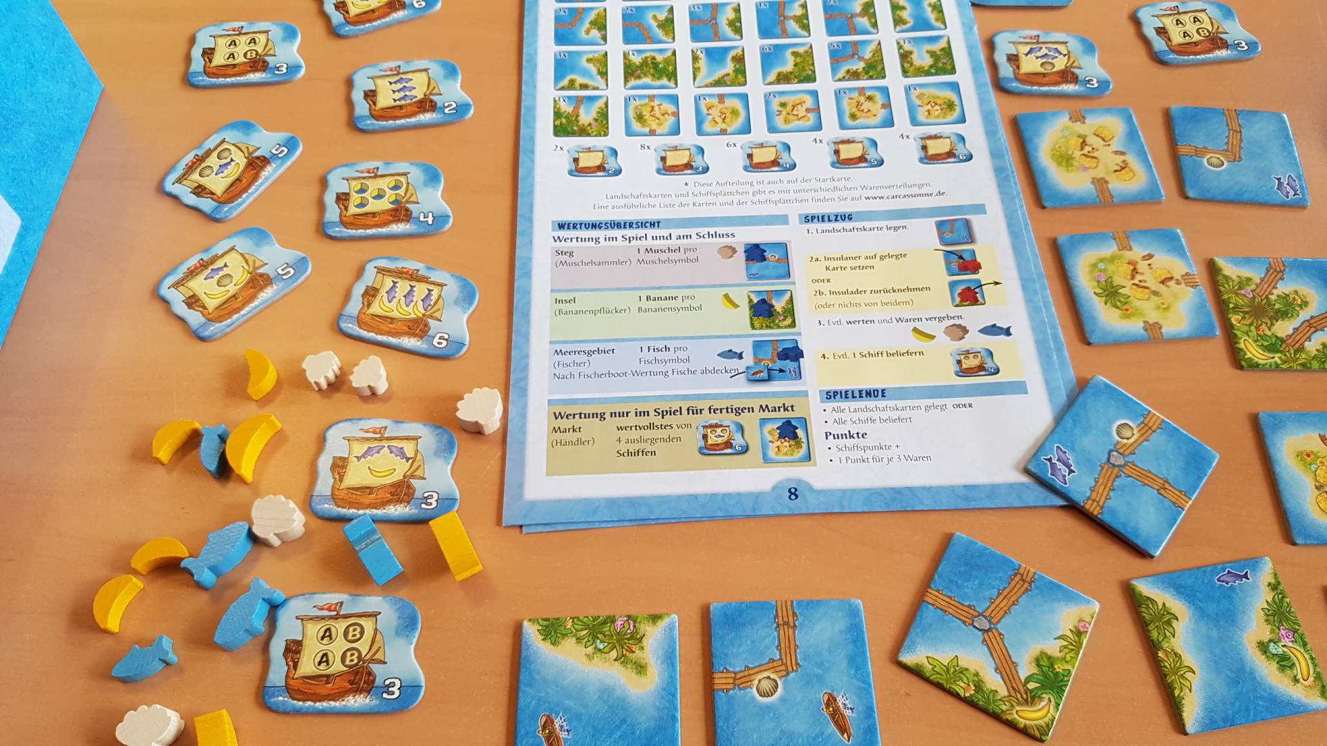 Statt Punkte sammelt Ihr in Carcassonne Südsee Waren auf den verschiedenen Gebieten. Wer ankommende Handelschiffe am besten mit Bananen, Muscheln und Fischen versorgt, wird König der Südsee.