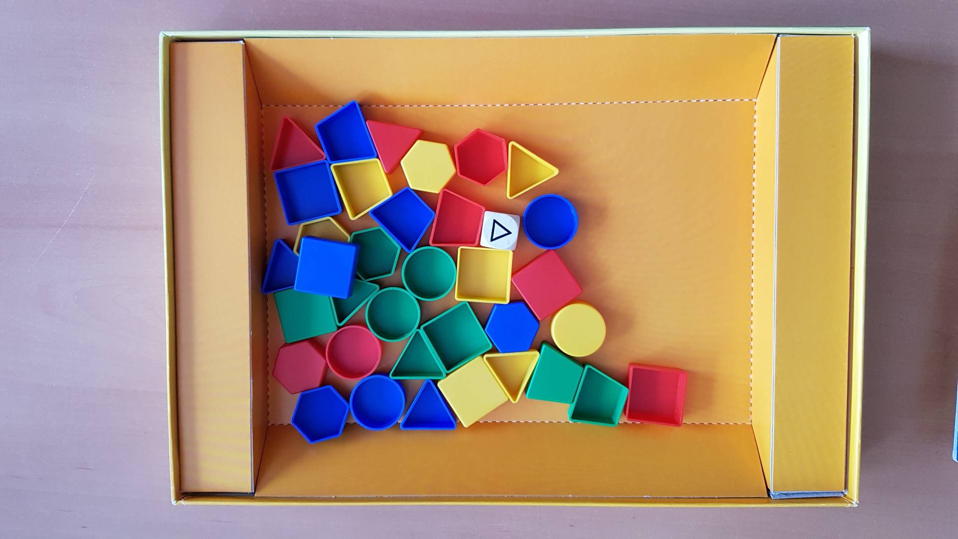 Rote Kreise, gelbe Vierecke, blaue Dreiecke - ein kunterbuntes Durcheinander! Deine Würfel zeigen ein Viereck und die Farbe Blau: Findest du ein blaues Viereck? Such dir ein passendes Feld auf dem Spielplan und setze deinen Spielstein hinein. Wer zuerst alle Spielsteine auf dem Plan untergebracht hat, gewinnt das Spiel.