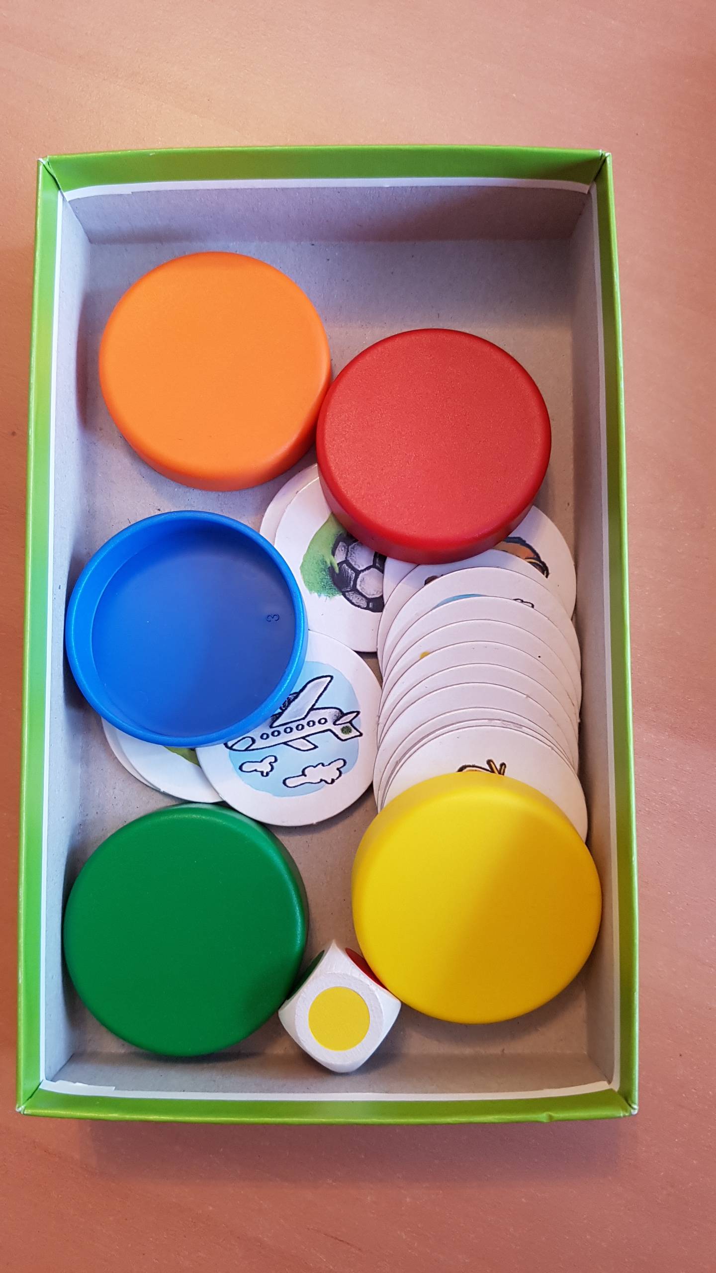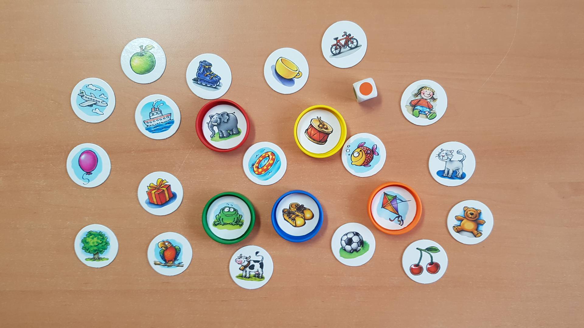 Unter der roten Scheibe liegt der Fisch und unter der grünen Scheibe ist die Birne. Aber was steckt bloß unter der orangen Scheibe?