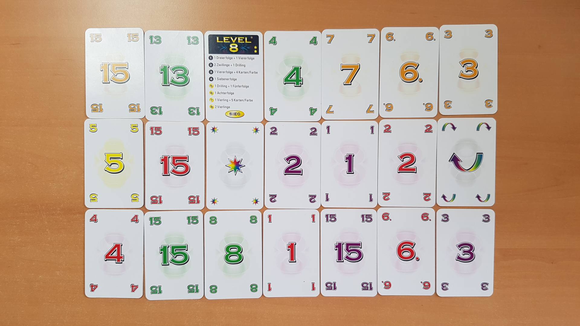 8 unterschiedliche Kombinationen von Karten müssen nacheinander ausgelegt werden. Jeder Spieler bekommt 8 Levelplättchen, auf denen vorgegeben ist, welche Kombinationen das sind. Sobald ein Spieler die letzte seiner 10 Handkarten abgespielt hat, werden alle Karten neu gemischt und verteilt. Danach spielt jeder Spieler in seinem Level weiter. Es wird so lange gespielt, bis ein Spieler alle 8 Level erfüllt hat. Wem gelingt es als Erstem, die Aufgabe des 8. Levels zu erfüllen?