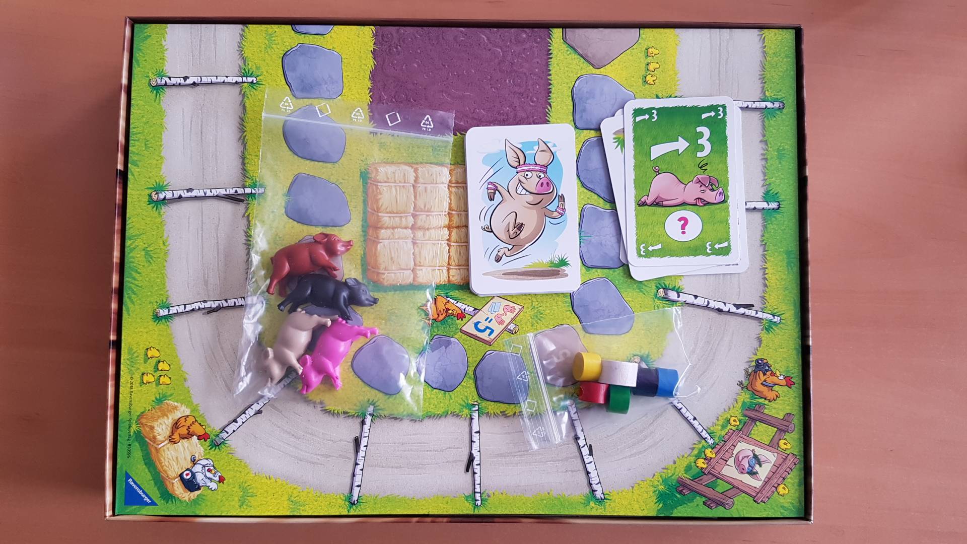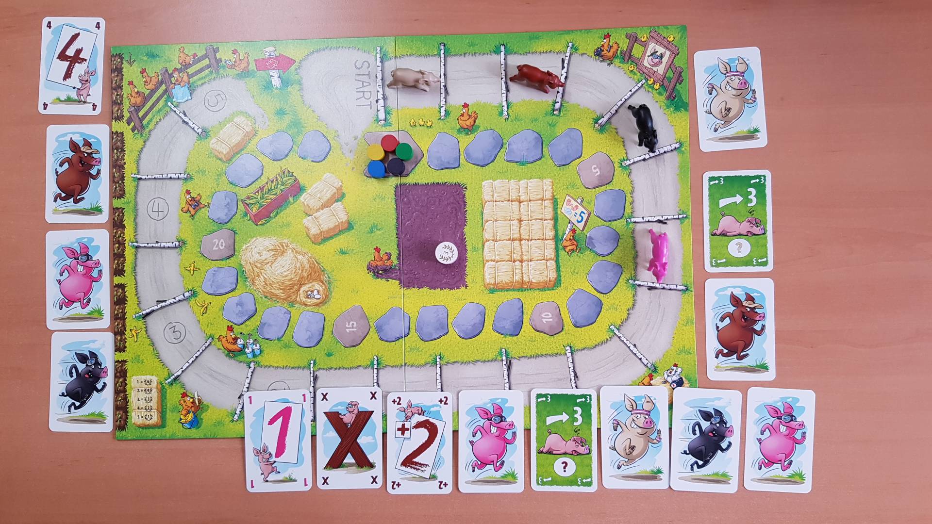 Mau Mau (a.k.a. UNO) is a game that everybody knows in Germany, but Sau Mau Mau adds new dimensions to the game. Played cards move four pigs around the race track, and players must bet on which pigs will do best in the race. Which one will be in the lead at the finish line?