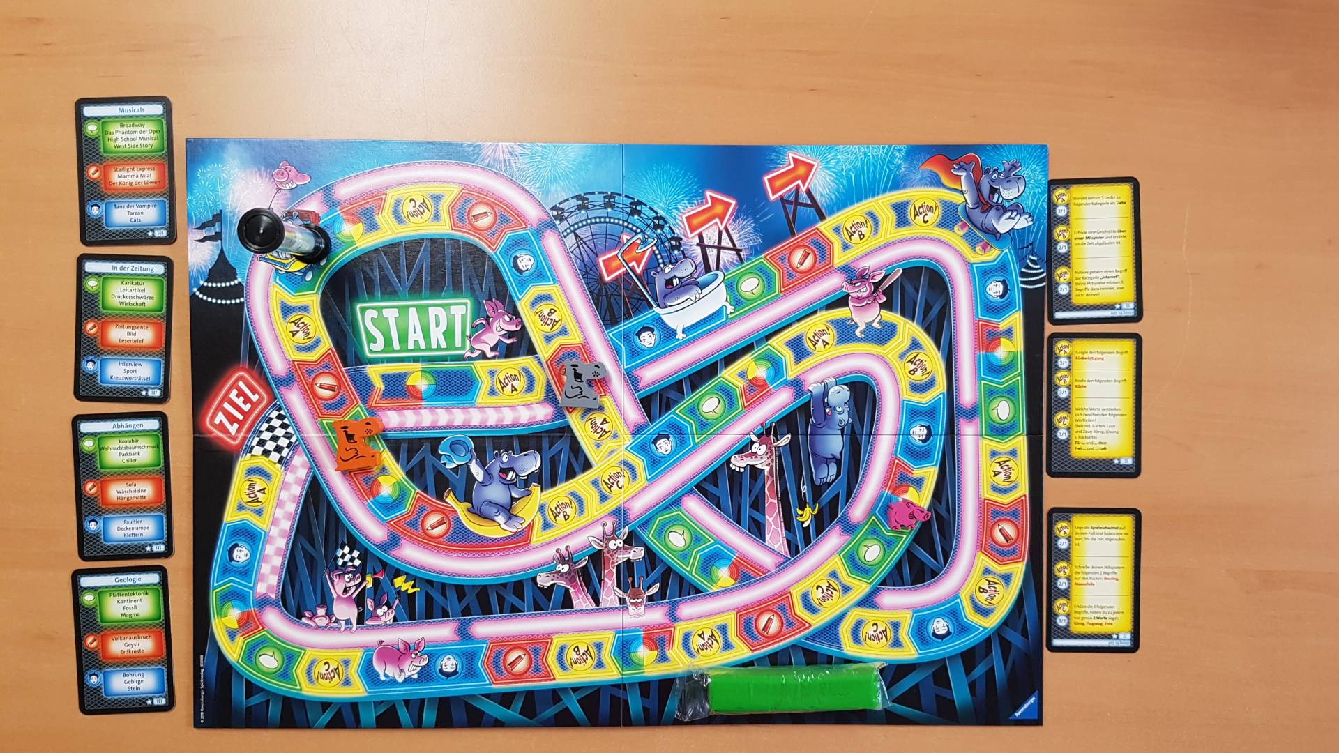 ... und dann nichts wie losgebraust! Schließlich ist nicht jeden Tag ein turbulentes Wettrennen von Nilpferden in einer Achterbahn angesagt. Und wer möchte das nicht gewinnen? Doch schon am ersten Anstieg gehts rund: Nilpferd parken - Begriff ausdenken - umschreiben und von den Mitspielern erraten lassen. Unterwegs darf geblödelt, geraten, geknetet, Pantomime gespielt und gelacht werden. Wers gut macht, kommt schnell voran, wers besser macht, noch schneller. Und wer sein Nilpferd als erster durchs Ziel zieht, ist der Achterbahn-König.