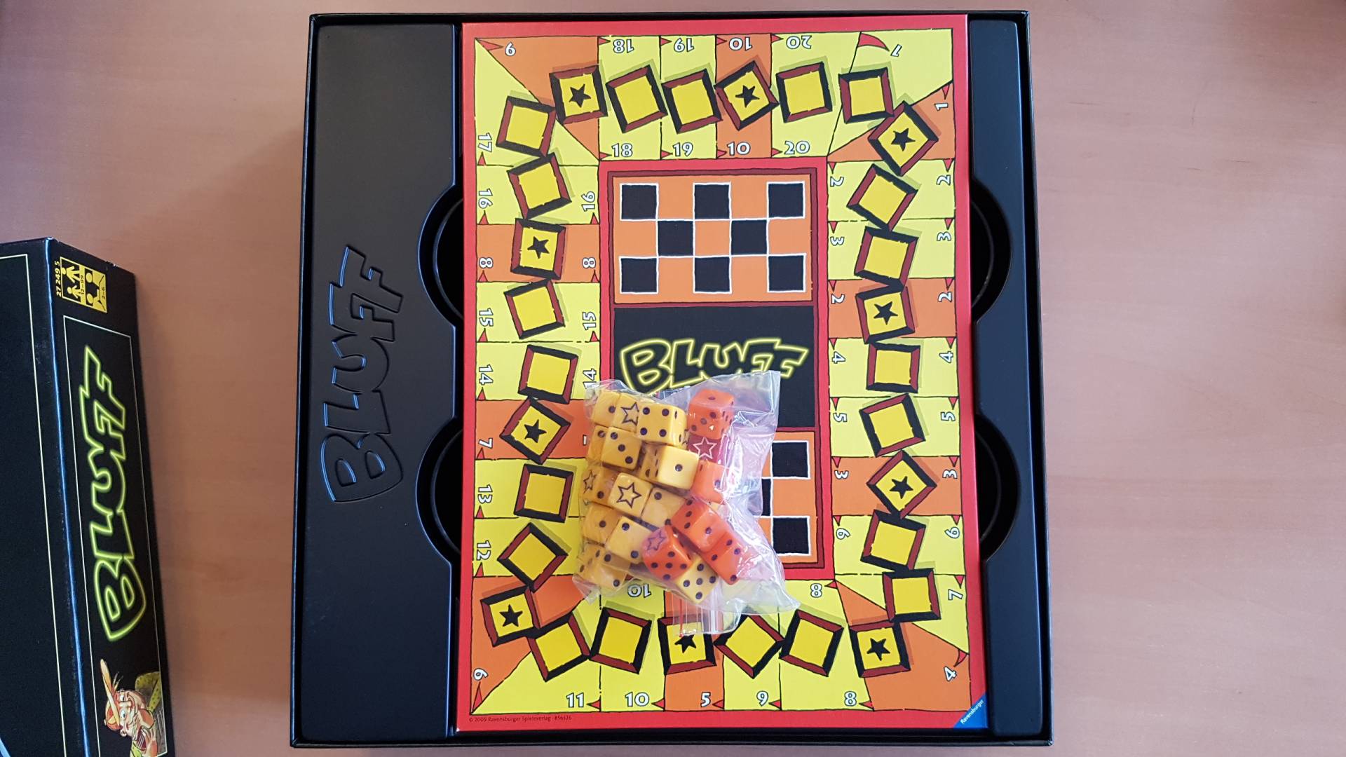 Bei Bluff kommt, wie es der Name schon sagt auf s Bluffen an. Jeder Spieler würfelt verdeckt. Dann wird reihum geschätzt, wie viele Zahlen jeweils gewürfelt wurden; sind es mindestens 3 6er, 6 4er oder 8 1er? Nach jeder Schätzung muss sich der nächste Spieler entscheiden, ob er seinem Vordermann glaubt, oder nicht. Glaubt er ihm, muss er einen höheren Schätzwert abgeben.