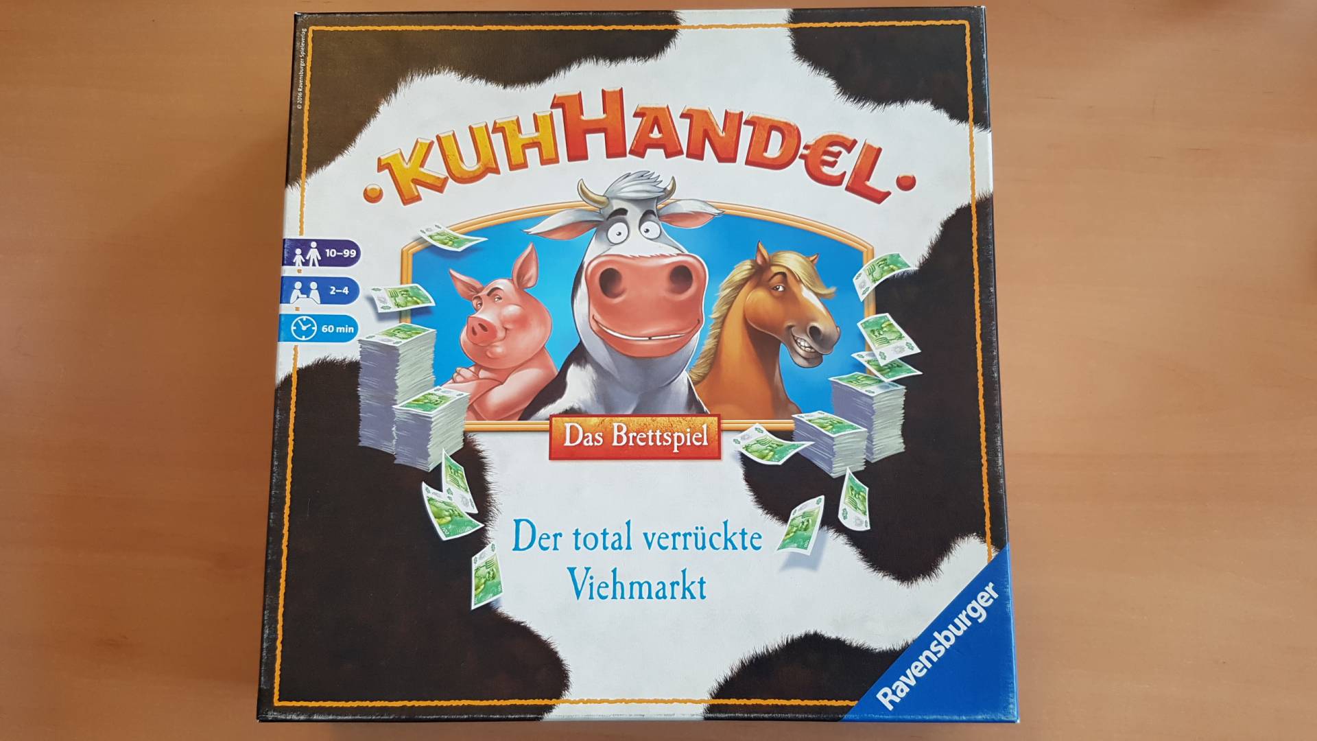 Erleben Sie den Kartenspiel-Klassiker erstmals als Brettspiel! Hier erwarten Sie Viecher, Versteigerungen und noch viel mehr: Erhöhen Sie auf dem Markt den Wert Ihrer Tiere, schnappen Sie sich beim Sparschwein frisches Geld und versuchen Sie an der Losbude Ihr Glück! Ob im knackig-kurzen Einstiegsspiel oder im Profispiel für Kuhhandel-Kenner: Abwechslung ist garantiert! Denn 10 verschiedene Versteigerungen sorgen für immer wieder neue, spannende Partien. Und mit den Tierbabys kommt jetzt auch der Nachwuchs mit ins Spiel! Kuhhandel Brettspiel: Mehr Kuhhandel geht nicht. (Quelle Ravensburger)