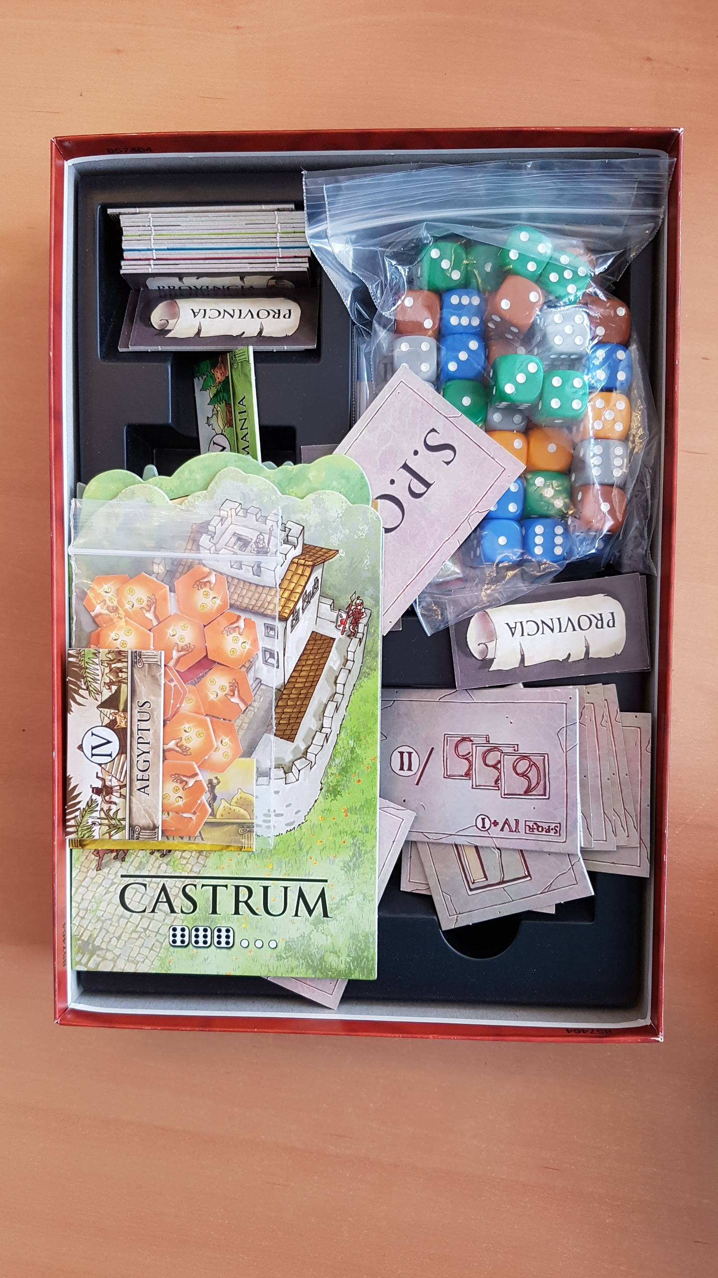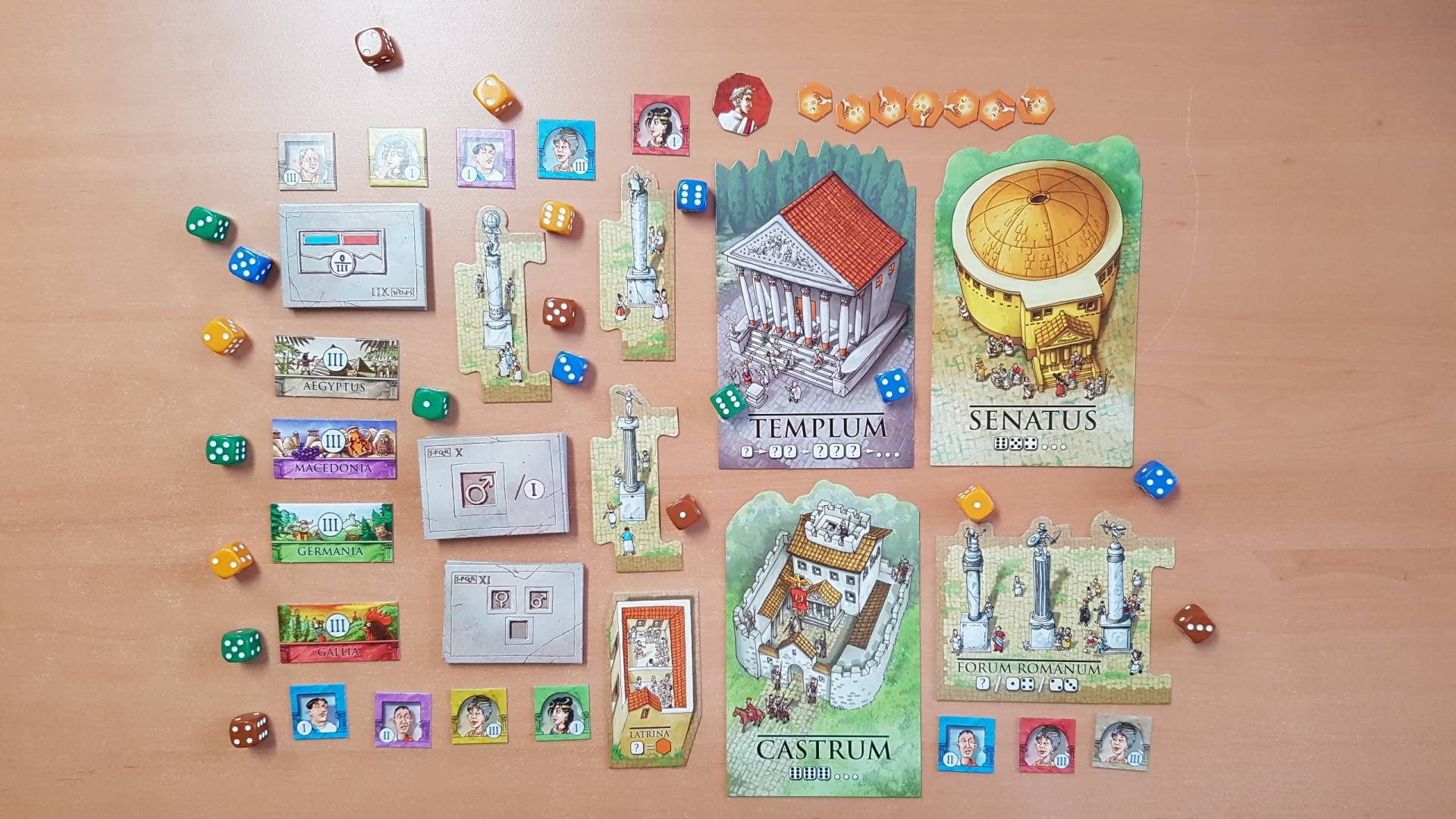 Die Römer verteilen ihre Würfel jeweils gemäß ihrer Werte auf vier Gebäude. In jedem der Gebäude herrschen etwas andere Regeln. In der Kaserne entscheiden die höchsten Paschs darüber, ob und in welcher Reihenfolge sich die Eroberer Germania, Hispania, Macedonia oder andere Provinzen unter den Nagel reißen dürfen, die gerade zur Wahl stehen. Im Forum Romanum verdrängt die jeweils niedrigste Augenzahl alle höheren und sichert dem Besitzer das Zugriffsrecht auf die Patrizier und Patrizierinnen, die sich dort gerade ein Stelldichein geben. Wer nun schon zu viele seiner acht Würfel gesetzt hat, verpasst vielleicht just die entscheidende Möglichkeit, im Senat Einfluss zu nehmen. Dort darf der Besitzer der wertvollsten Zahlenreihe als Erster aus stets wechselnden Bonuskarten wählen, um den eigenen Eroberungen neuen Wert zu verleihen. Im Tempel wiederum, Sitz von Fortuna, überbietet man sich mit der Zahl der Würfel und der Augen, um direkt aus „göttlicher Gnade“ Siegpunkte zu empfangen.