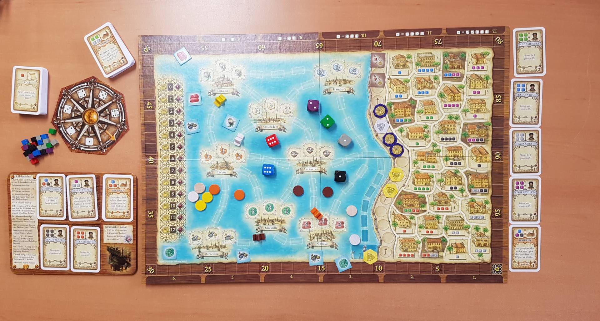 Zunächst muss jeder Spieler eine neue Spielkarte auswählen, anschließend zwei der sechs Würfel, die ihm die Spiel entscheidenden Aktionssteine einbringen. Danach müssen die gerade vorrätigen Aktionssteine verbraucht werden, indem man beispielsweise seine Spielkarten „aktiviert“, einen Stadtteil in Besitz nimmt oder sein Schiff bewegt und so Waren nach Europa verschifft. Wer hierbei das meiste Geschick und die beste Voraussicht an den Tag legt, wird seine Prestigepunkte stetig erhöhen und so dem Spielsieg näher und näher kommen …