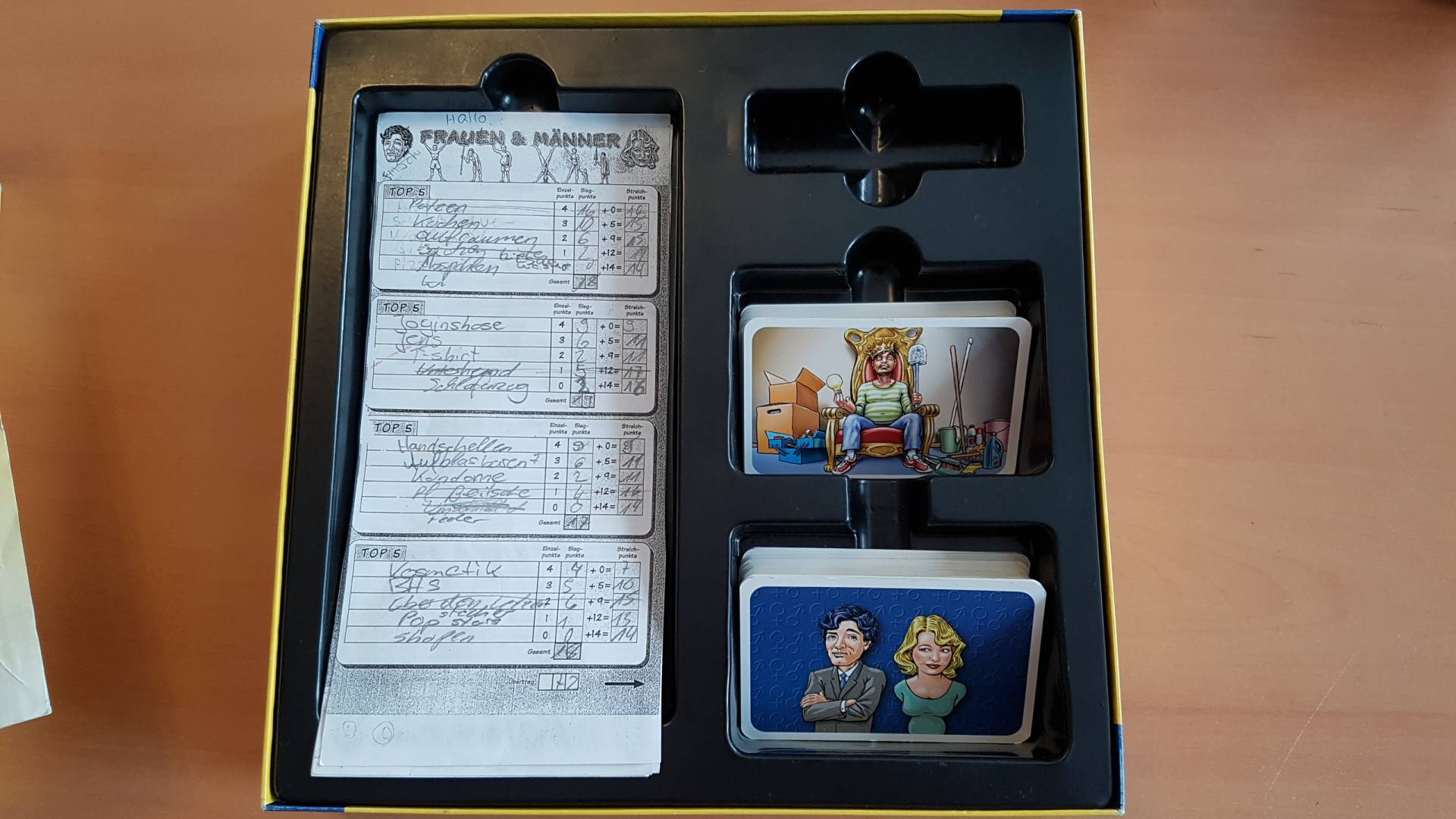 Wichtig bei „Frauen & Männer“ ist ein Block mit raffiniert ausgetüftelten Auswertungsformularen, dazu noch Spielkarten mit einem Angebot von 600 Fragen bzw. Themen, sowie Bildkarten, die zu eigenen Ideen anregen. – Bei den vorgegebenen Fragen wechseln „harmlose“, wie z.B. „Woran Männer am liebsten herumbasteln“ mit voll konkreten wie „Wo finden Frauen Körperbehaarung bei Männern am wenigsten sexy?“. Und „Was hat Dieter Bohlen eigentlich, das andere Männer nicht haben?“ „Was sollte ein Mann besser nicht in die Mikrowelle stecken?“ „Was sind die unoriginellsten Anmachsprüche?“ Oder „Wonach riechen Frauen?“