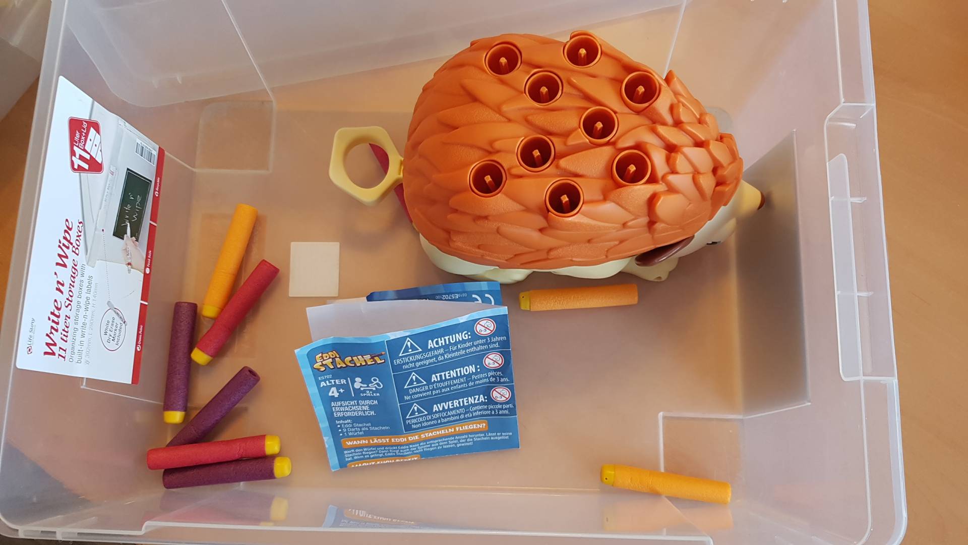 Who will make the porcupine pop? This exciting kids game combines simple play with silliness and suspense. Roll the die, press the porcupine s nose that number of times, and hope his darts don t fly out. No one knows when that will happen, and the only player not to make the porcupine pop wins. Kids can switch up the gameplay and try a round where whoever makes him pop first wins. Or try a game where each dart color is assigned points and when the porcupine pops, players race to grab as many darts as they can, and the player with the most points wins.