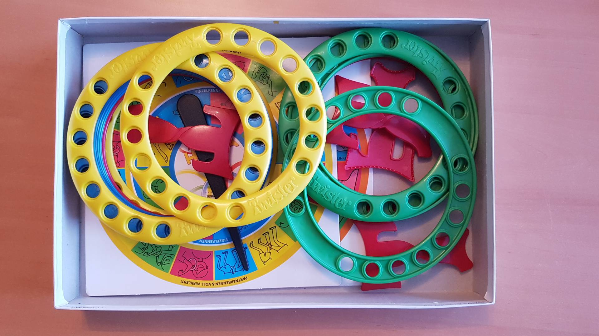 MB Twister Hoopla. Der brandneue Twister-Spielspaß für Drinnen, Draußen und unterwegs ganz ohne Twister-Matte: Jetzt musst du mit deinen Freunden neue Verknotungs-Akrobatik einstudieren, um am Ende als Twister-Meister zu glänzen. Anstelle der Twister-Matte spielst du mit bunten Ringen, die so über Beine, Kopf oder Arme gestülpt werden müssen, wie es das Drehrad auf der Twister-Scheibe vorgibt. Gelber Ring in der Kniekehle berührt roten Ring am linken Ellenbogen: Eine ganz neue Herausforderung an die Gelenkigkeit der Spielrunde mit absoluter Spaß-Garantie.
