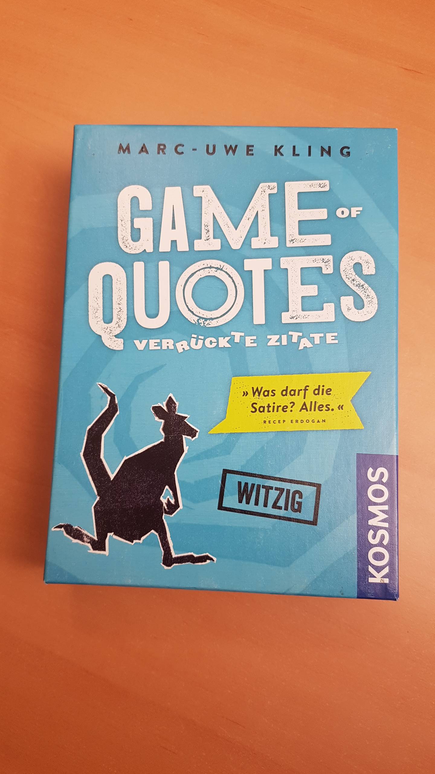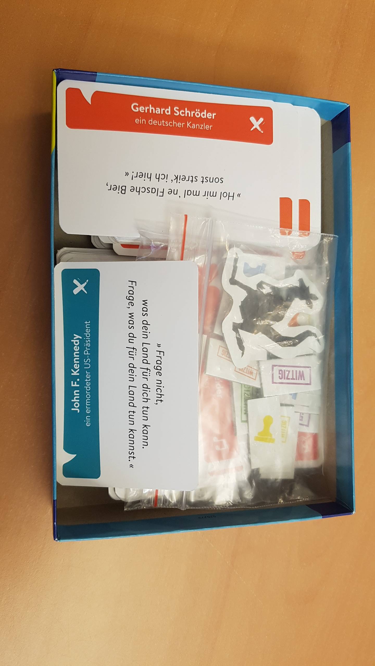 Verrückte Zitate: Jeder wählt ein Zitat und schiebt es einem falschen Autor unter. In fünf abwechslungsreichen Runden mit steigendem Schwierigkeitsgrad kann jeder seine Kreativität beim Verrücken der Zitate beweisen. Wer sich lustige Kombinationen ausdenkt, wird von den anderen nicht nur mit Gelächter, sondern auch mit WITZIGStempeln belohnt und gewinnt dadurch vielleicht das Spiel.