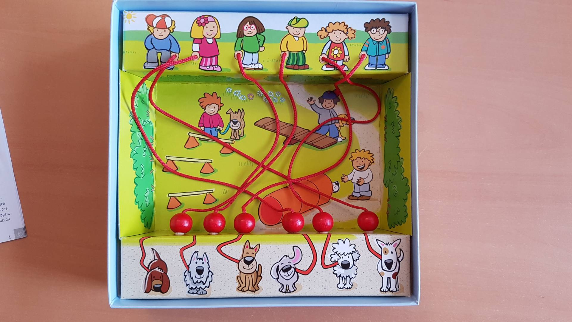 Im Schachtelinneren sind 6 Kinder durch Hundeleinen, die immer wieder auf der gegenüberliegenden Seite in Löchern angesteckt werden, mit den 6 Hunden verbunden. Dazwischen liegen die Schnüre wirr durcheinander. Das Kind mit der gezogenen Eigenschaft muss dem richtigen Hund zugeordnet werden. Belohnung ist das Hunde-Plättchen.