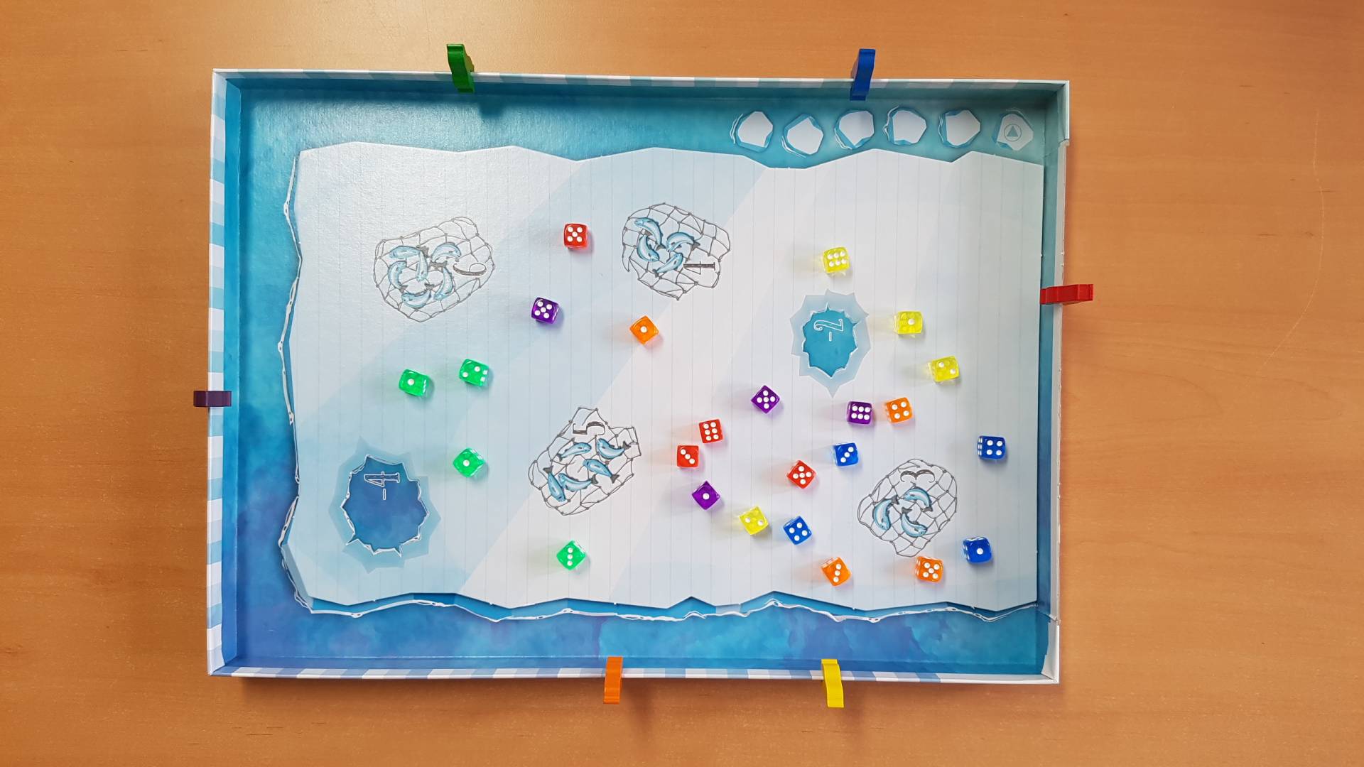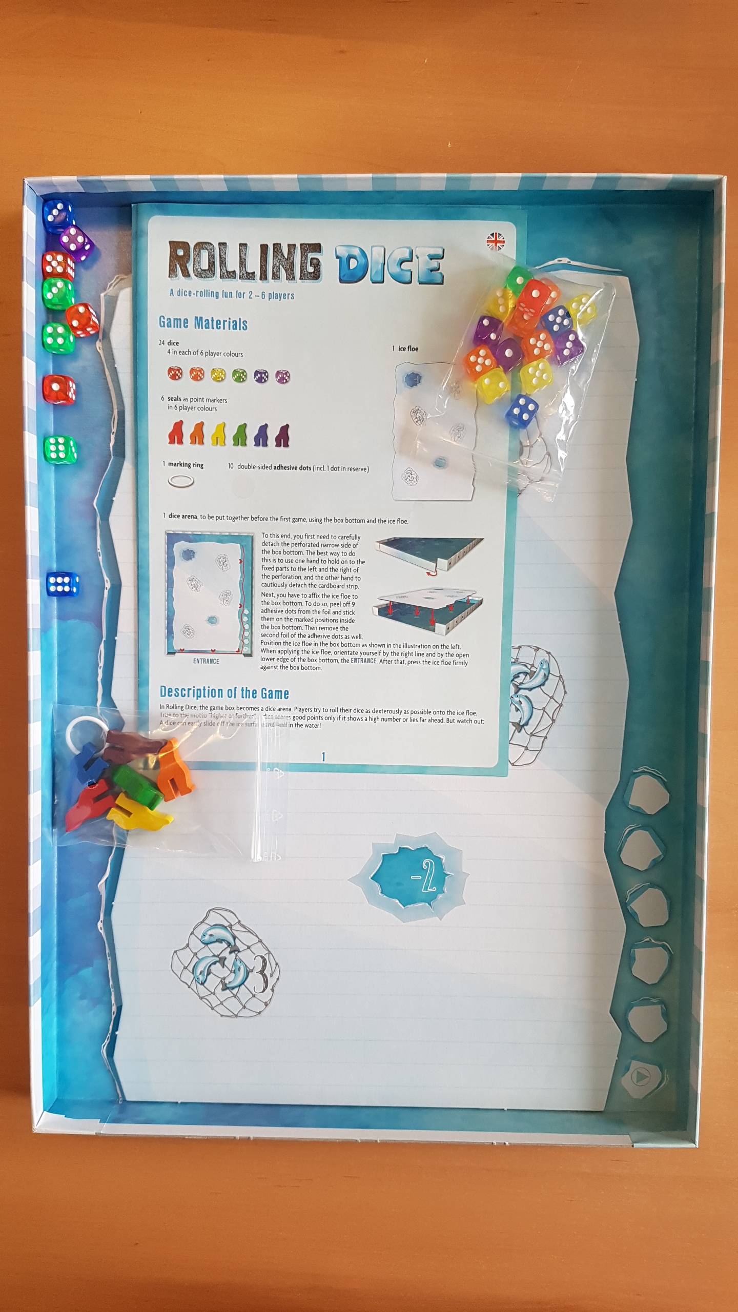 Bei Rolling Dice wird die Spielschachtel zur Würfelarena. Dabei versuchen die Spieler ihre Würfel möglichst geschickt auf die Eisscholle zu würfeln. Denn getreu dem Motto „höher oder weiter“ bringt nur ein Würfel Punkte, der eine hohe Augenzahl zeigt oder weit vorn liegt. Doch aufgepasst – schnell rutscht ein Würfel von der Eisfläche und landet im Wasser!
