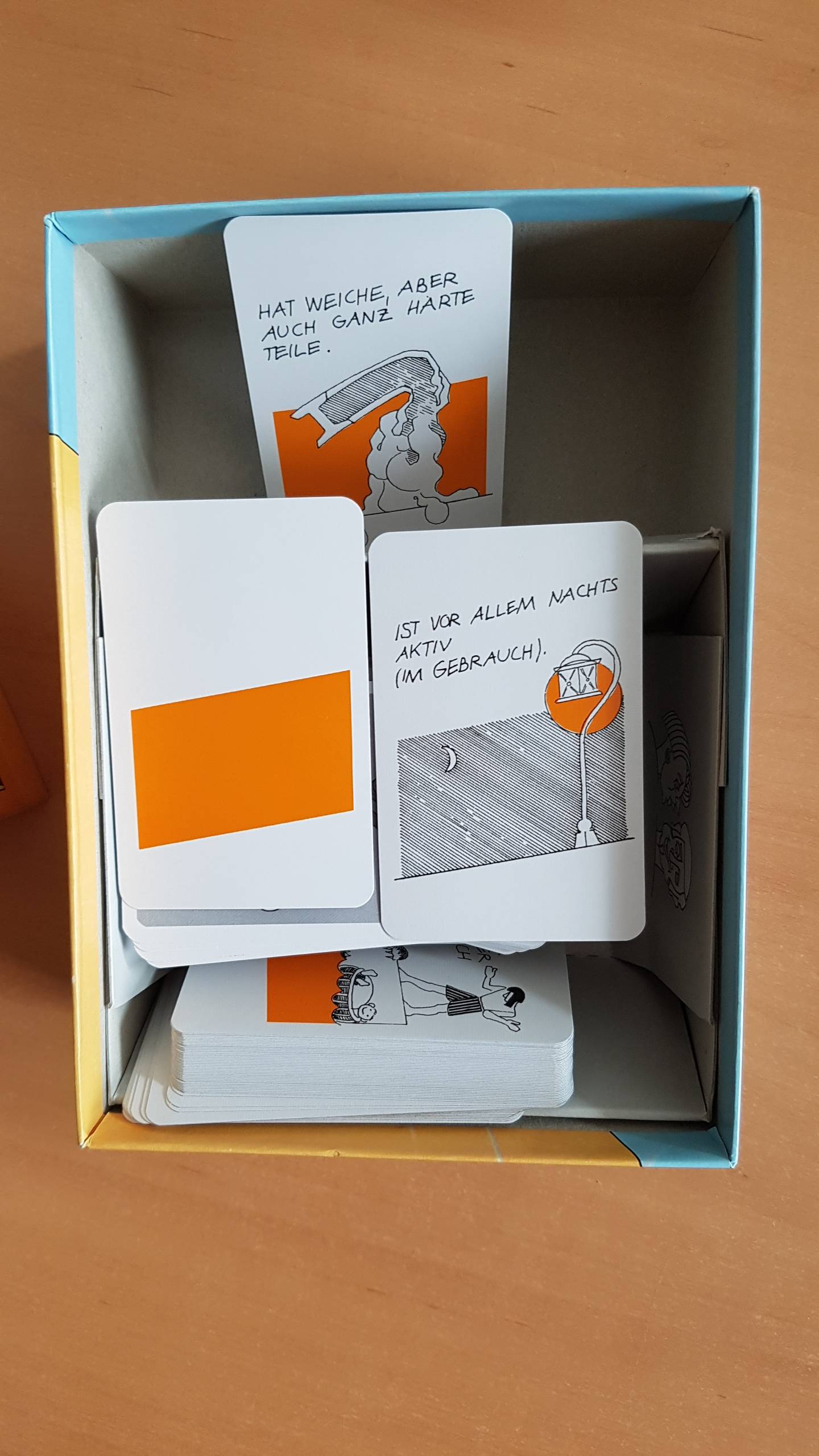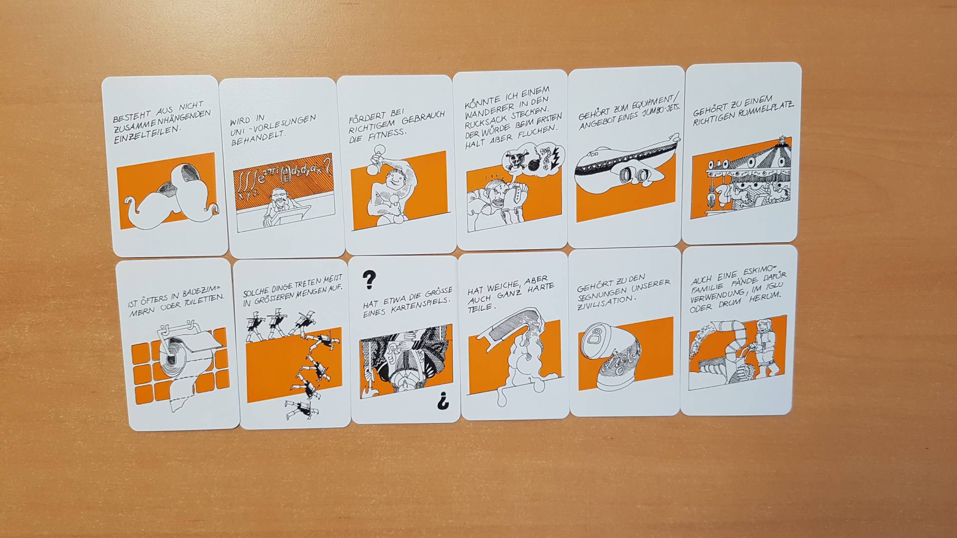 Was soll das sein? "hat außen eine Haut, Fell oder Schuppen" - "leider haben solche Dinge schon etliche Menschen ums Leben gebracht" - "es gibt einen Film, in dem dieses Ding eine wichtige Rolle spielt". Na klar, der weiße Hai! Man muss einfach seine karten loswerden, also noch eine Beschreibung dazu werfen: "Wenn Gäste kommen kann man mit ihm spielen." Na dann viel Spass!