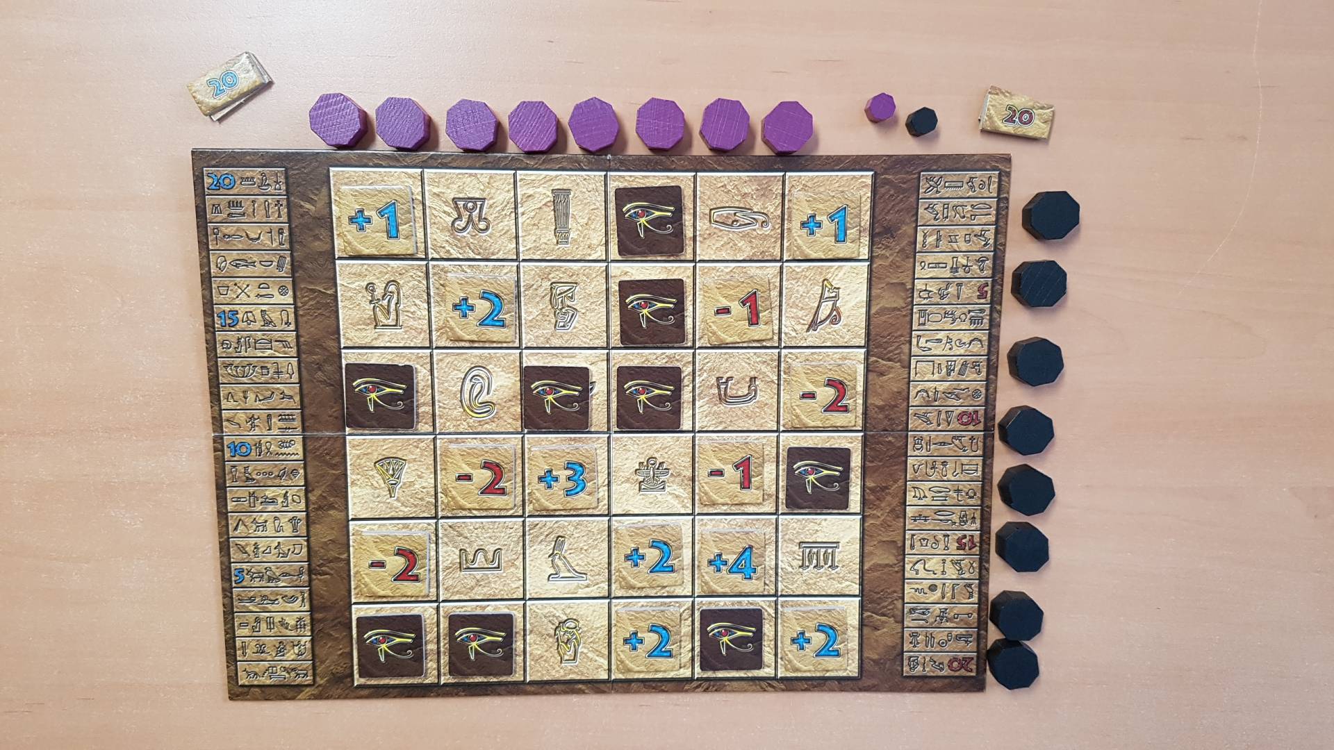 Das besondere Spannungselement von Isis & Osiris liegt darin, dass die Spieler ihre Spielsteine auf dem Plan unterbringen müssen. Setzen sie diese zu früh, legen ihnen die Mitspieler Plättchen mit dicken Minuspunkten daneben. Setzen sie ihre Steine zu spät, sind nur noch Plätze übrig, die wenig Pluspunkte oder sogar Minuspunkte bringen. Da die Spieler außerdem ihre eigenen Plättchen nicht kennen und deren Wert erst beim Aufdecken sehen, ist jedes Plättchen eine kleine Entdeckung. Und während die einen mit den Zähnen knirschen, begleiten die anderen das Legen des Plättchens mit schadenfrohen Kommentaren.