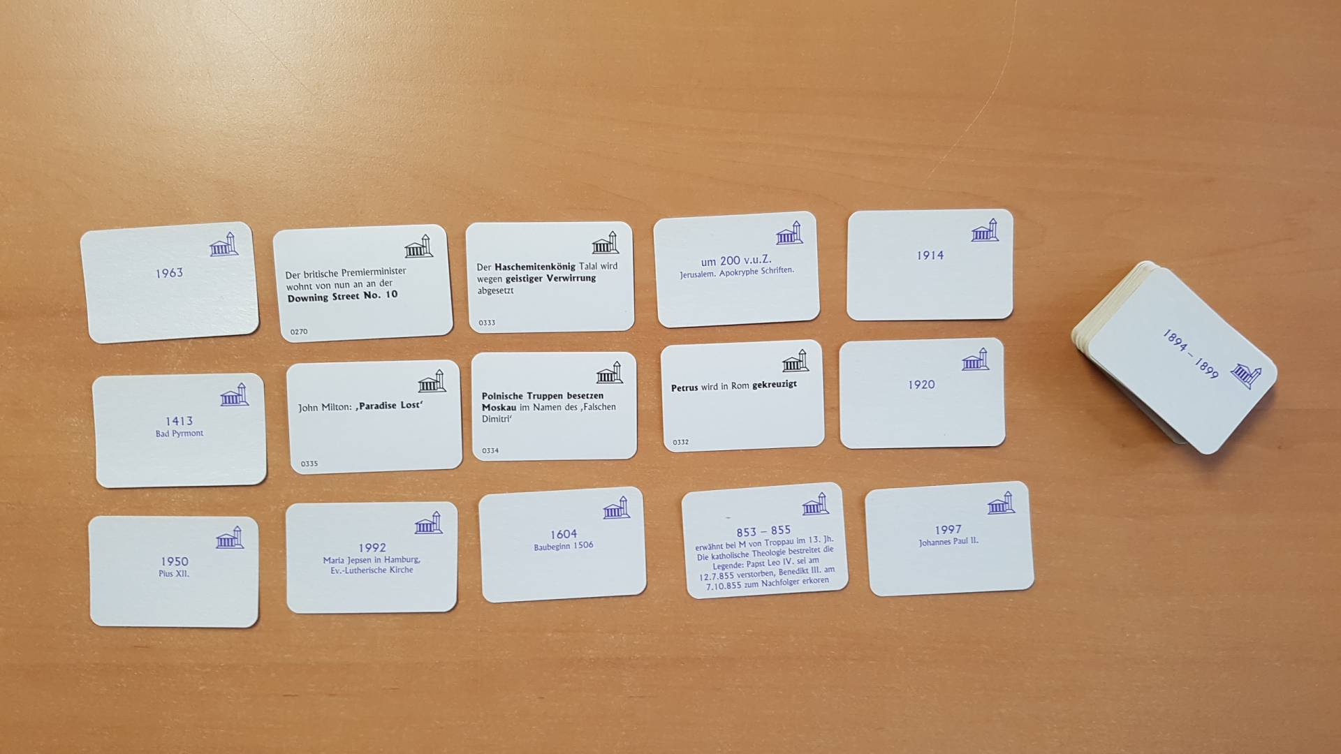 Jeder Spieler erhält 9 Karten. Eine Startkarte wird in die Tischmitte gelegt. Der Startspieler legt eine seiner Karten an die Startkarte an. Liegt das gelegte Ereignis zeitlich vor der Startkarte, wird sie oberhalb der Startkarte angelegt. Liegt das Ereignis zeitlich später, wird sie darunter gelegt.