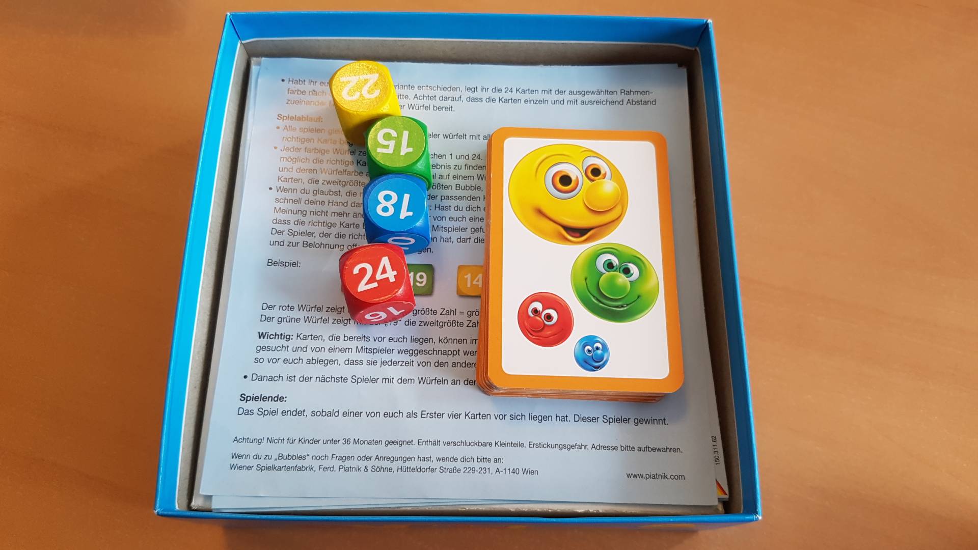 Entsprechend dem Wurfergebnis der vier Würfel in den Farben gelb, rot, blau und grün, gilt es die Karte zu finden, auf der die Bubbles in dieser Kombination abgebildet sind: Die größte Zahl auf einem Würfel entspricht auch dem größten Bubble in dieser Farbe, die zweitgrößte Zahl dem zweitgrößten Bubble, und so weiter. Konzentration und schnelle Reaktion sind bei Bubbles von Wolfgang Dirscherl gefragt!