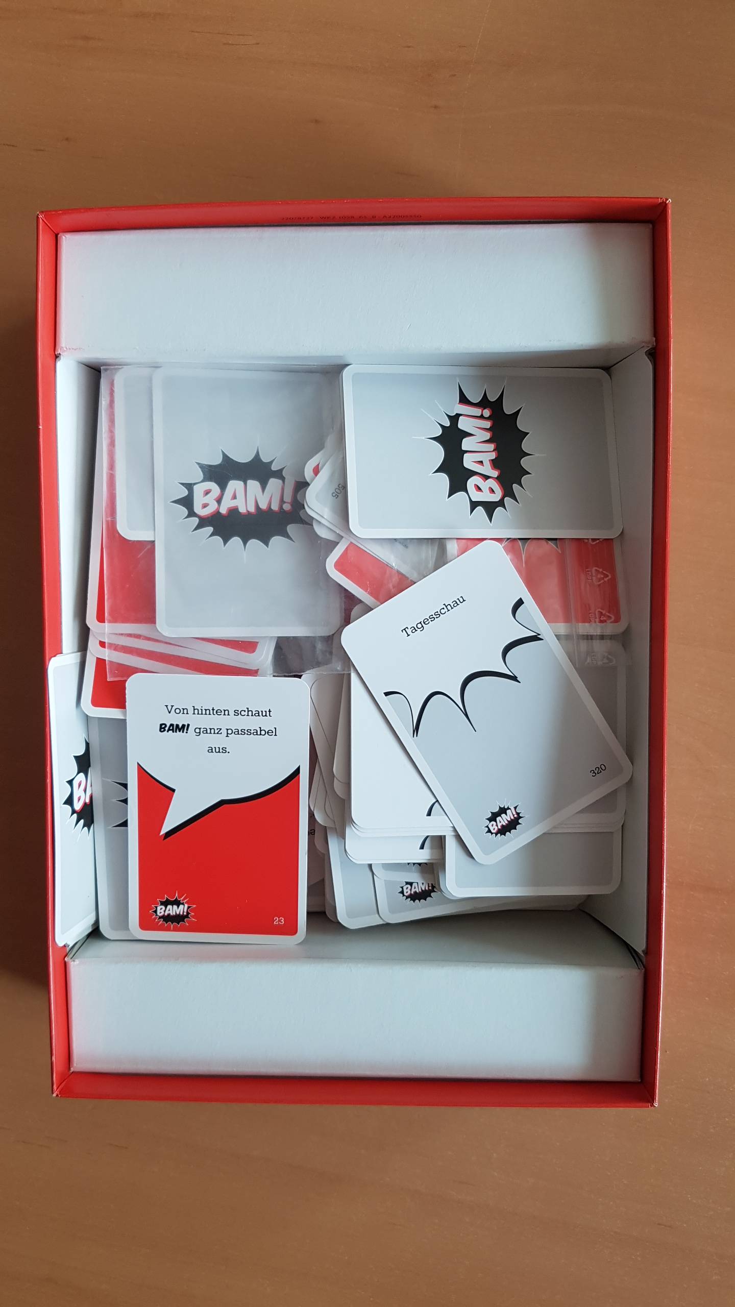 BAM! ist das unanständig geniale Partyspiel, das garantiert für jede Menge Spielspaß sorgt! Hier gleicht keine Runde der anderen! In diesem einfach witzigen Partyspiel besteht die Aufgabe jedes Spielers darin, die Lückentexte mit Begriffen zu füllen und mit dem Ergebnis zunächst den BAM!-Master und dann seine Mitspieler zu begeistern. Wenn die Frage „Deutschland sucht BAM!“ lautet, sind die auf fast 400 Karten verfügbaren Begriffe durchaus hilfreich. „BAM!“ muss es dann bei den Mitspielern machen, wenn man eine seiner Antwortkarten ausspielt. Ob ein „Knackiger Skilehrer“ passend oder unpassend ist und was „Deutschland sucht“, das entscheidet hier ganz undemokratisch der BAM!-Master alleine. Bei BAM! ist erfolgreich, wer seine Freunde zu Begeisterungsstürmen, Freudentränen und La-Ola Wellen bewegen kann! Aber aufgepasst, die Mitspieler sind immer als nächste als BAM!-Master an der Reihe.