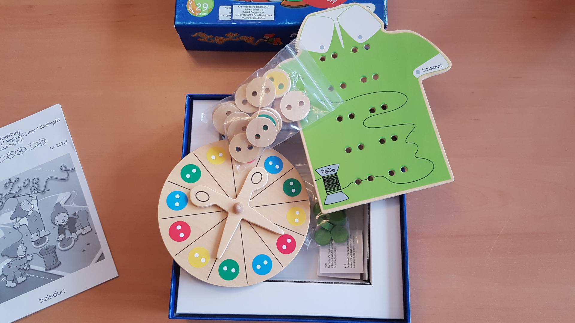 Hier können sich die Kleinen mit Hilfe von Nadel und Faden, Schere und Knöpfen als Schneiderlein versuchen. Mit ein wenig Glück und Geschick sind die bunten Knöpfe im Handumdrehen am Hemd angenäht. - Fördert Geschicklichkeit, Farberkennung, Aufmerksamkeit, Feinmotorik.