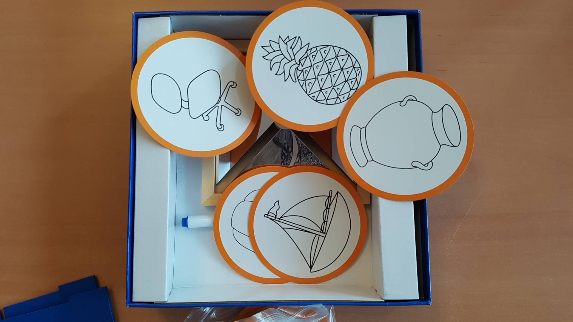 Die Spieler legen jeweils eine Karte mit dem Motiv nach unten auf das Spiegelelement. Nun raten alle nacheinander, um was für ein Motiv es sich handeln könnte, indem sie die Spieglefläche vor sich prüfen. Der Spieler, der die richtige Antwort geben konnte, erhält die Karte und wer die meisten Karten sammelt, gewinnt das Spiel.