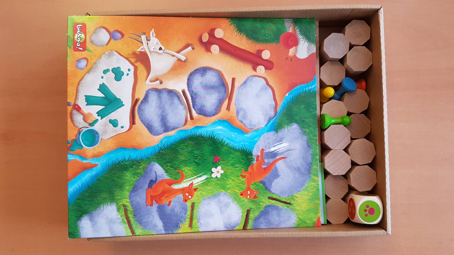 Movement game involving stuffed animals and other tools. You turn over a card and perform the task described. If he has completed it, he draws a piece of wood, which he places on the tower. If the tower remains standing, you roll the dice and move the game piece forward accordingly; if it lands on the kangaroo, it jumps to the next one. The player who crosses the finish line on the game board wins.