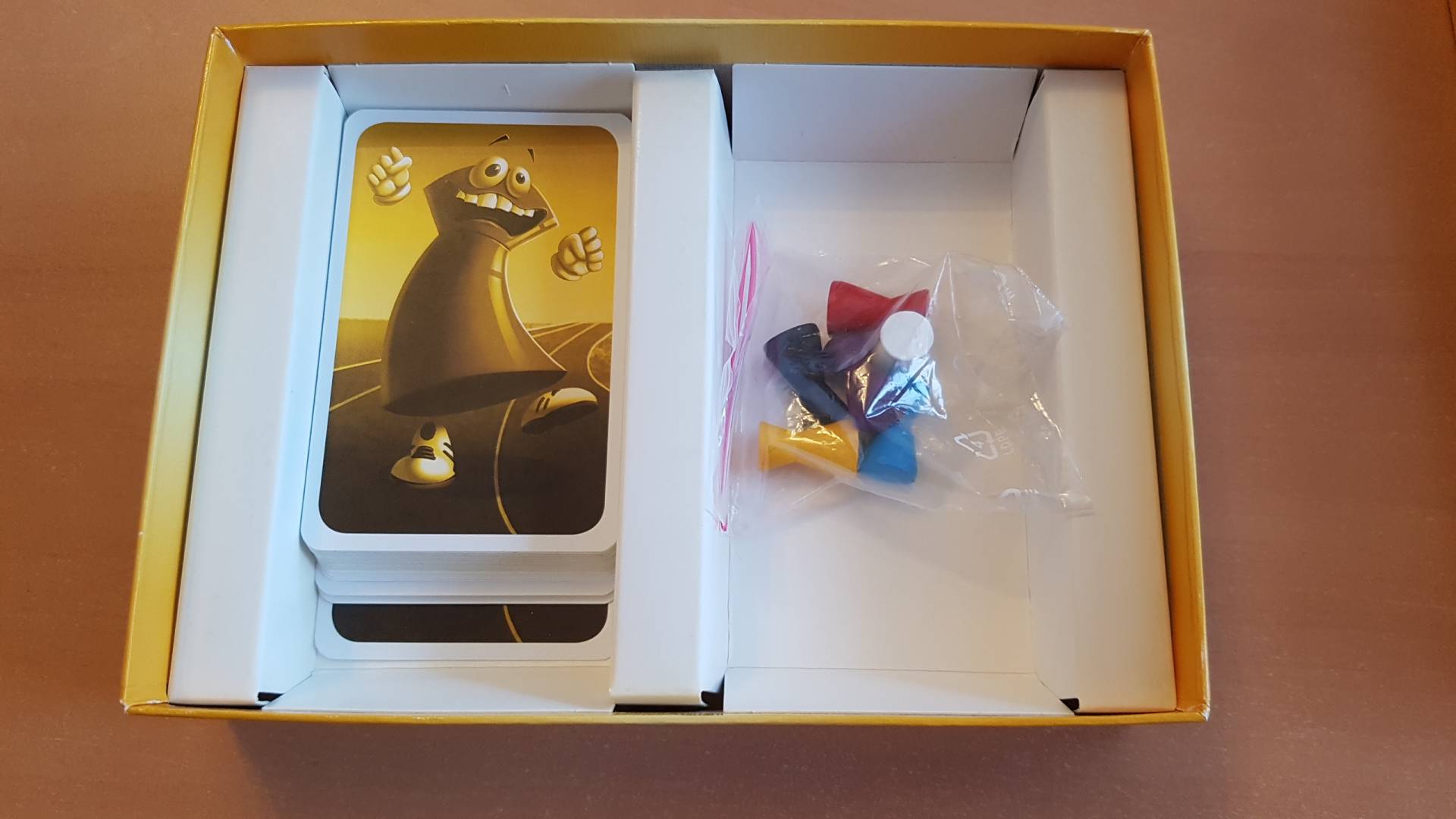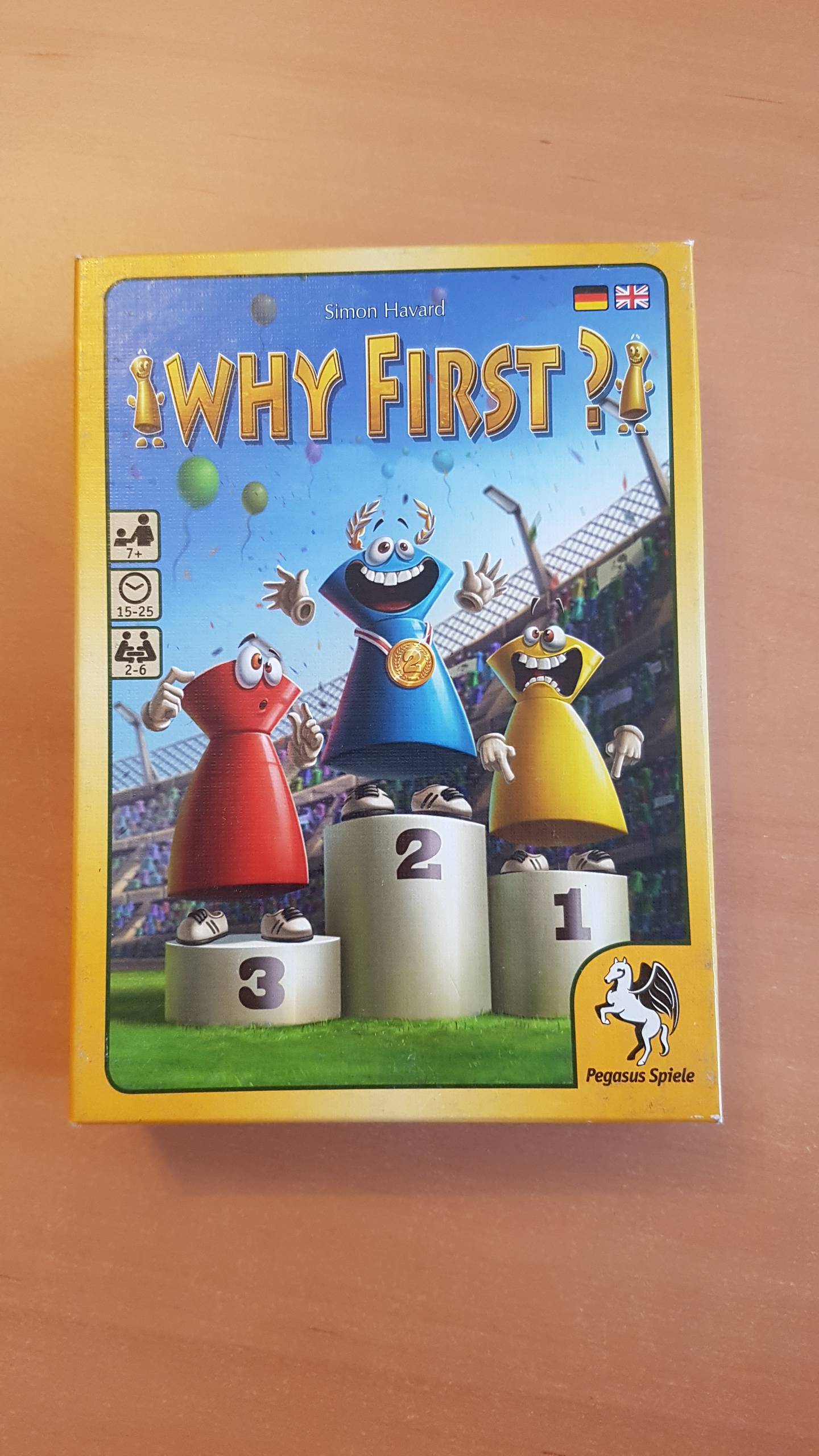 Why First? verwickelt kleine und große Raser in fünf schnelle Rennrunden. In jeder Runde können die Spieler ihre Handkarten nutzen, um entweder ihre eigene oder die Figur eines Mitspielers auf dem Spielplan zu bewegen. Dazu legen sie pro Zug gleichzeitig eine ihrer Karten vor einen beliebigen Spieler – da lässt sich so mancher Plan schnellstens durchkreuzen. Punkte erhält schließlich nur, wer am Rundenende auf Rang zwei liegt – und nach fünf turbulenten Runden triumphiert der Spieler mit den zweitmeisten Punkten.