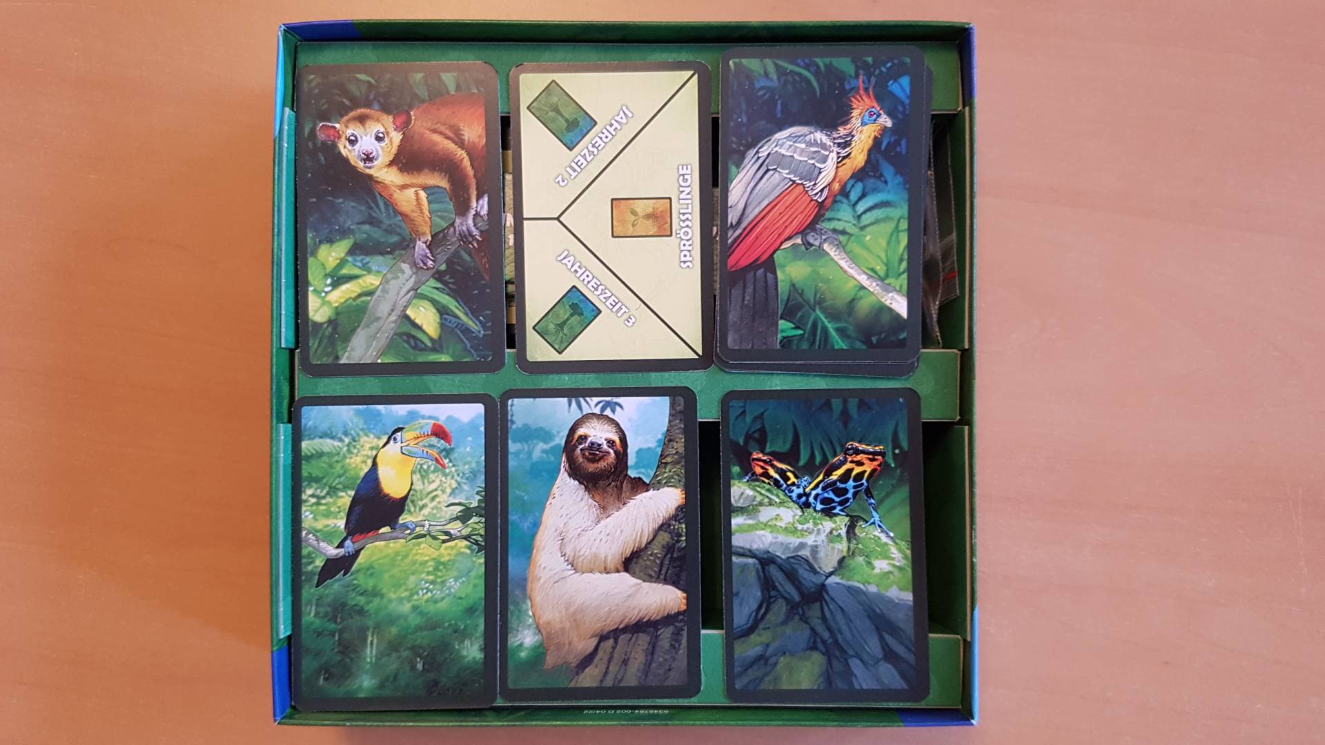 Wow! Bei diesem Spiel entsteht Spielkarte für Spielkarte ein wunderschöner Regenwald. Die Spieler draften die Karten und verschönern ihr kleines Paradies. Dabei müssen sie immer wieder ihre Entscheidungen abwägen. Die nächste gezogene Spielkarte könnte eine Dürre-Karte sein! Wer auf Karten verzichtet, beeinflusst die Auslage und kann beim nächsten Spielzug umso mehr gewinnen. Schon bald leben in diesem Kartenspiel Tukan und Faultier im Regenwald und es wachsen noch mehr unglaubliche Pflanzen. Wer am Ende von drei Jahreszeiten eine neue Heimat für die schönsten Bäume und Pflanzen und die meisten Tiere erschaffen hat, gewinnt den Wettstreit! Ein tolles Gesellschaftsspiel und Geschenk mit Urlaubs-Feeling!