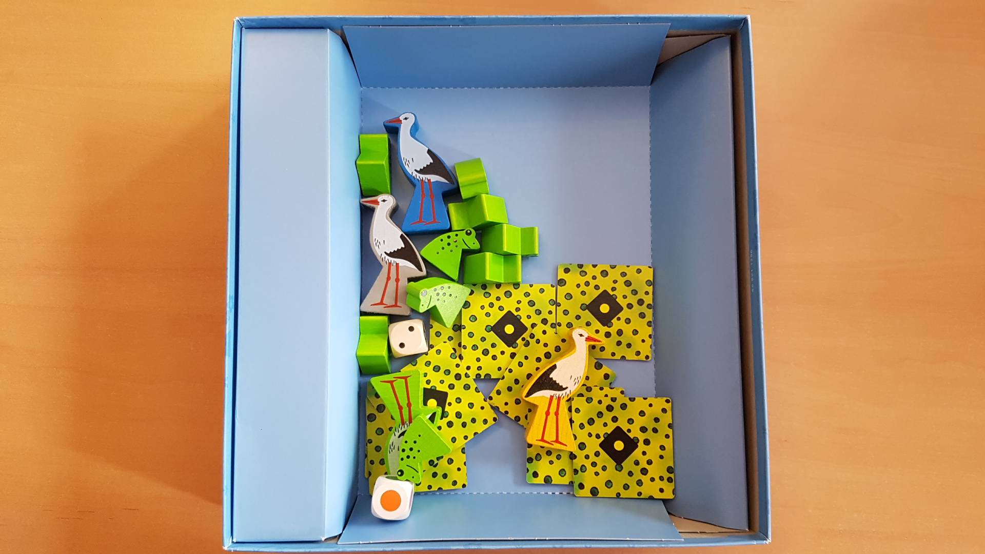Zwei bis vier Störche waten durch die Sümpfe und suchen nach ihrer Lieblingsspeise, den Fröschen. Es ist gar nicht so leicht, einen zu erwischen; denn die Fröschlein springen einfach weg und tauchen an einem ganz anderen Platz wieder auf. Aber mit Würfelglück und Überblick kriegen die Störche die Fröschlein doch. Und wer zuerst drei gefangen hat, gewinnt das Spiel. Fröschlein aufgepasst! ist der neueste Titel einer hochwertigen Serie von Kinderspielen. Alle Spiele werden nachhaltig in Deutschland produziert, mit Farben und Lacken auf Wasserbasis veredelt und auf kurzen Wegen transportiert.