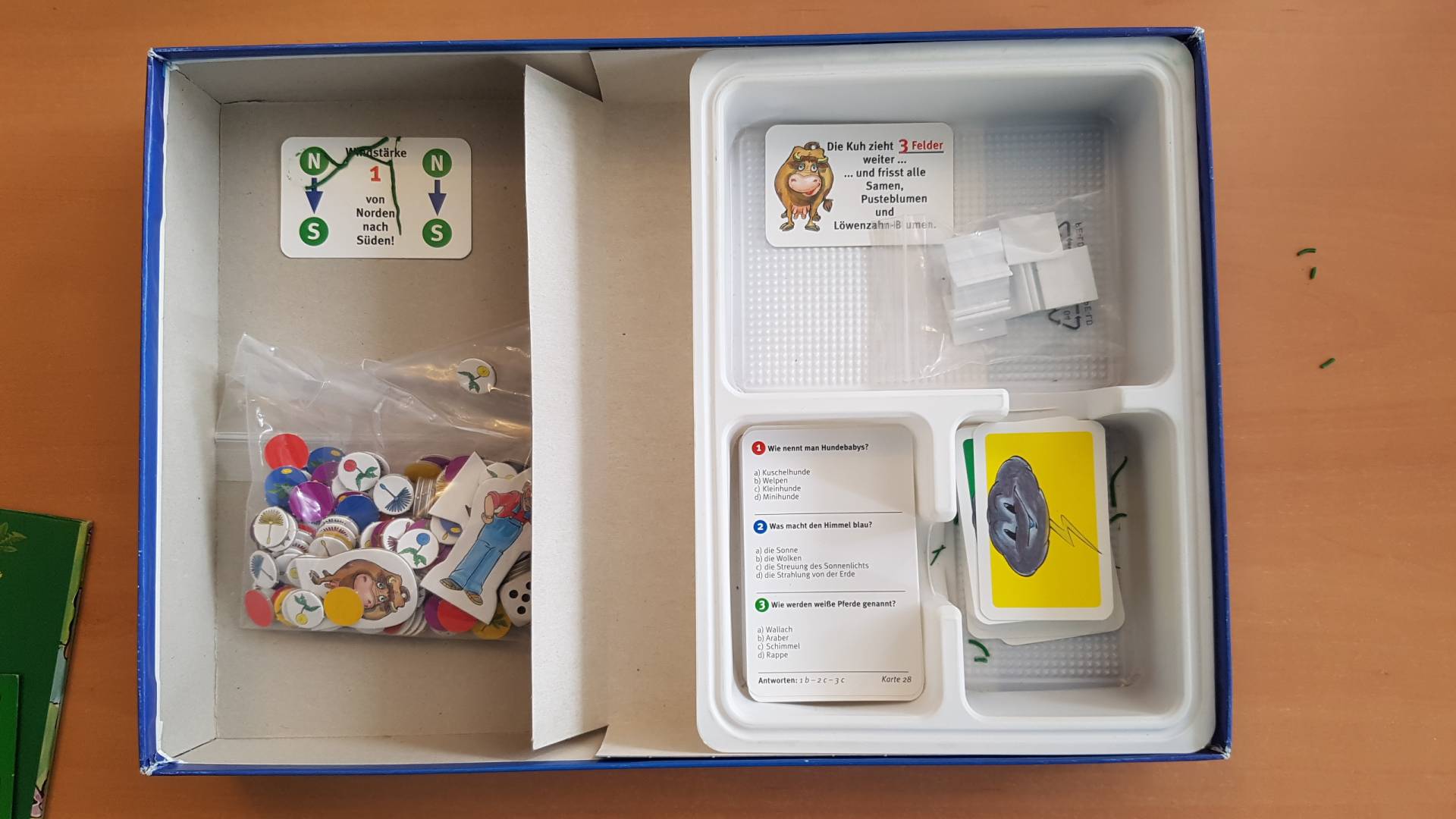 Jedes Kind weiß, dass die kugelförmige, weiße Blüte des Löwenzahns die Pusteblume aus vielen winzigen Samen besteht. Alle Spieler müssen auf der großen Wiese viele Löwenzahnblumen wachsen lassen. Jeder Spieler zieht abwechselnd mit den eigenen Löwenzahn-Samen (=Spielfiguren) und mit der gemeinsamen Spielfigur Biene. Dabei kommt man schneller zum Ziel, wenn man Fragen zum Löwenzahn richtig beantwortet und ein plötzlicher Windstoß die Löwenzahn-Samen weiterträgt. Doch aufgepasst: Da ist auch noch die gefräßige Kuh, der die Löwenzähne besonders gut schmecken. Wer als erster drei eigene Löwenzahnblumen in Peter Lustigs Garten besitzt, ist der glückliche Gewinner