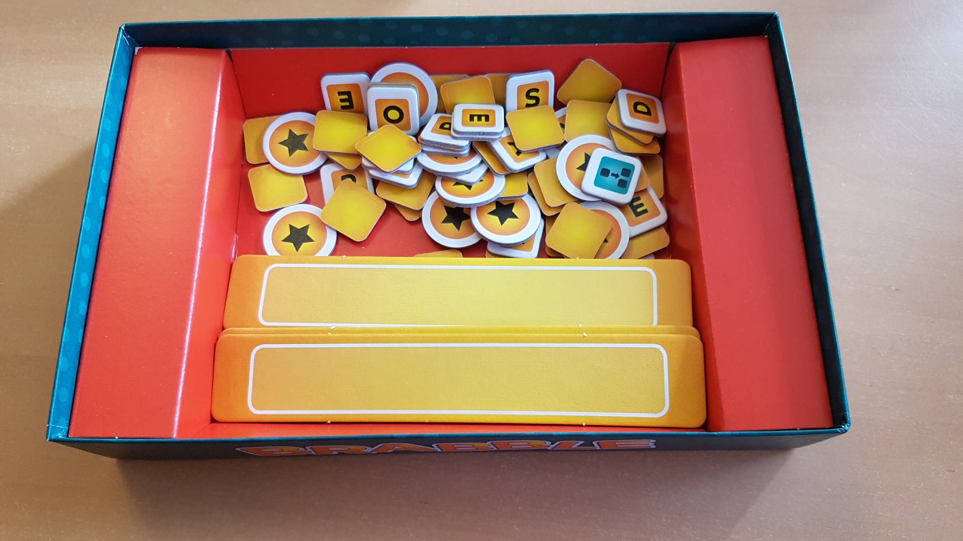 Auf den drei Rahmen sammeln sich während des Spiels immer mehr Buchstabenplättchen. Diese Buchstabenkombinationen ergeben oft keinen Sinn, sind aber in vielen Fällen ein Teil schon bestehender Worte.