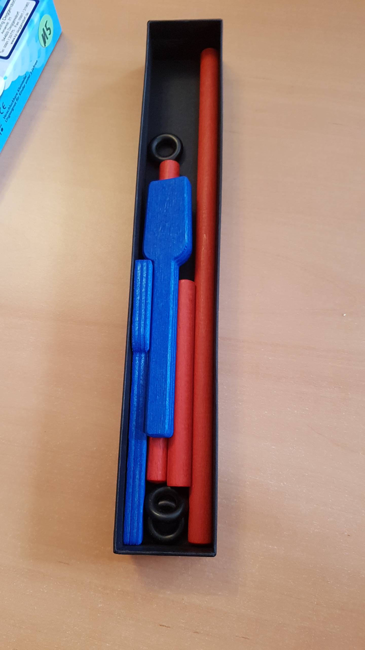 Ein Stab wird mit einer kleinen Holzkelle in aufrechter Position gehalten. Der Spieler lässt den Stab los, klopft mit der Kelle auf die Tischplatte und legt sie dann wieder oben auf den . . . zu langsam, der Stab ist längst umgefallen - das schafft man ja nie!
