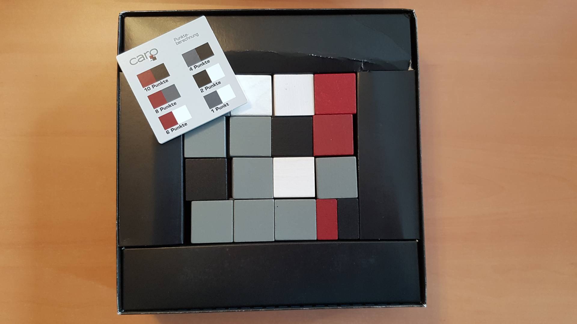 Das Strategiespiel für die ganze Familie mit hochwertigem Holzspielmaterial. Bauklötze legen war gestern – Strategie und Köpfchen ist heute! Bei „Caro“ ist um-die-Ecke-denken gefragt. Jeder Spieler legt der Reihe nach ein Quadrat an ein weiteres und stellt so eine punktebringende Farbkombination her. Dabei müssen die Caros so schlau platziert werden, dass möglichst viele Punkte eingeheimst werden können. Aber leichter gesagt als getan, denn der Platz ist begrenzt und nicht jede Verbindung erlaubt! Und auch die anderen Spieler werfen Ihnen bei jeder Gelegenheit Steine in den Weg. Das Spiel ist beendet, nachdem das letzte Caro gelegt wurde bzw. wenn kein Caro mehr gelegt werden kann.